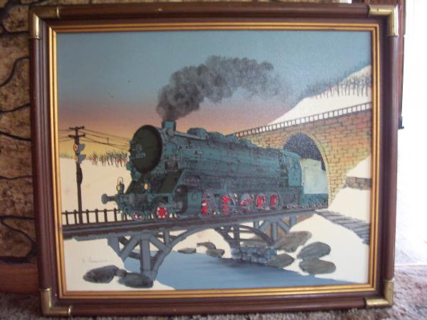 20 x 24 signed oil painting of locomotive train coming through tunnel bridge
