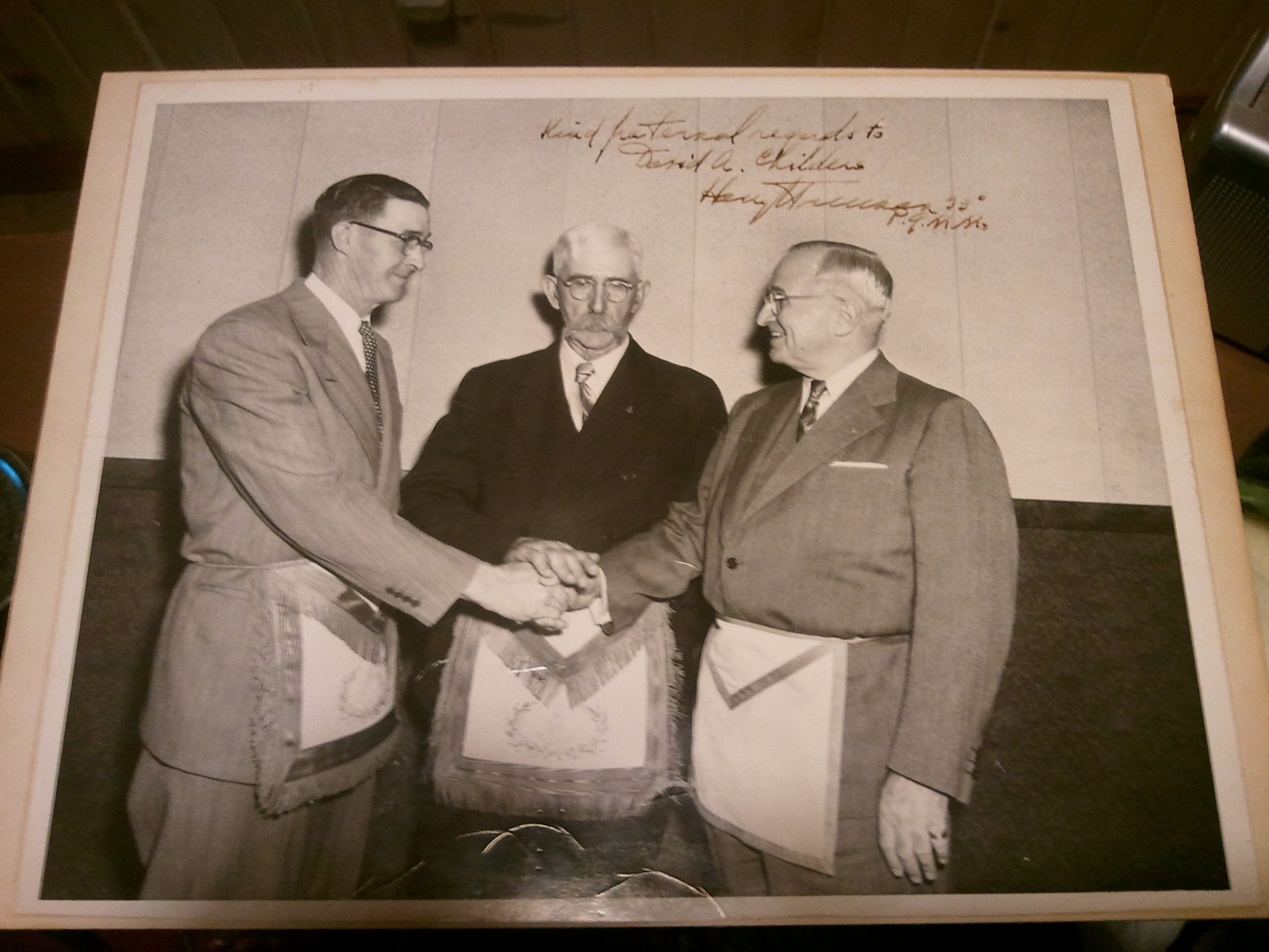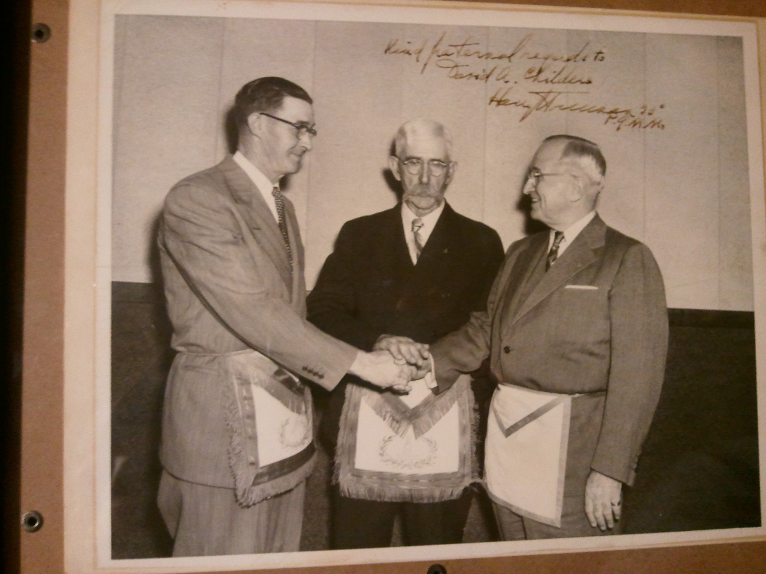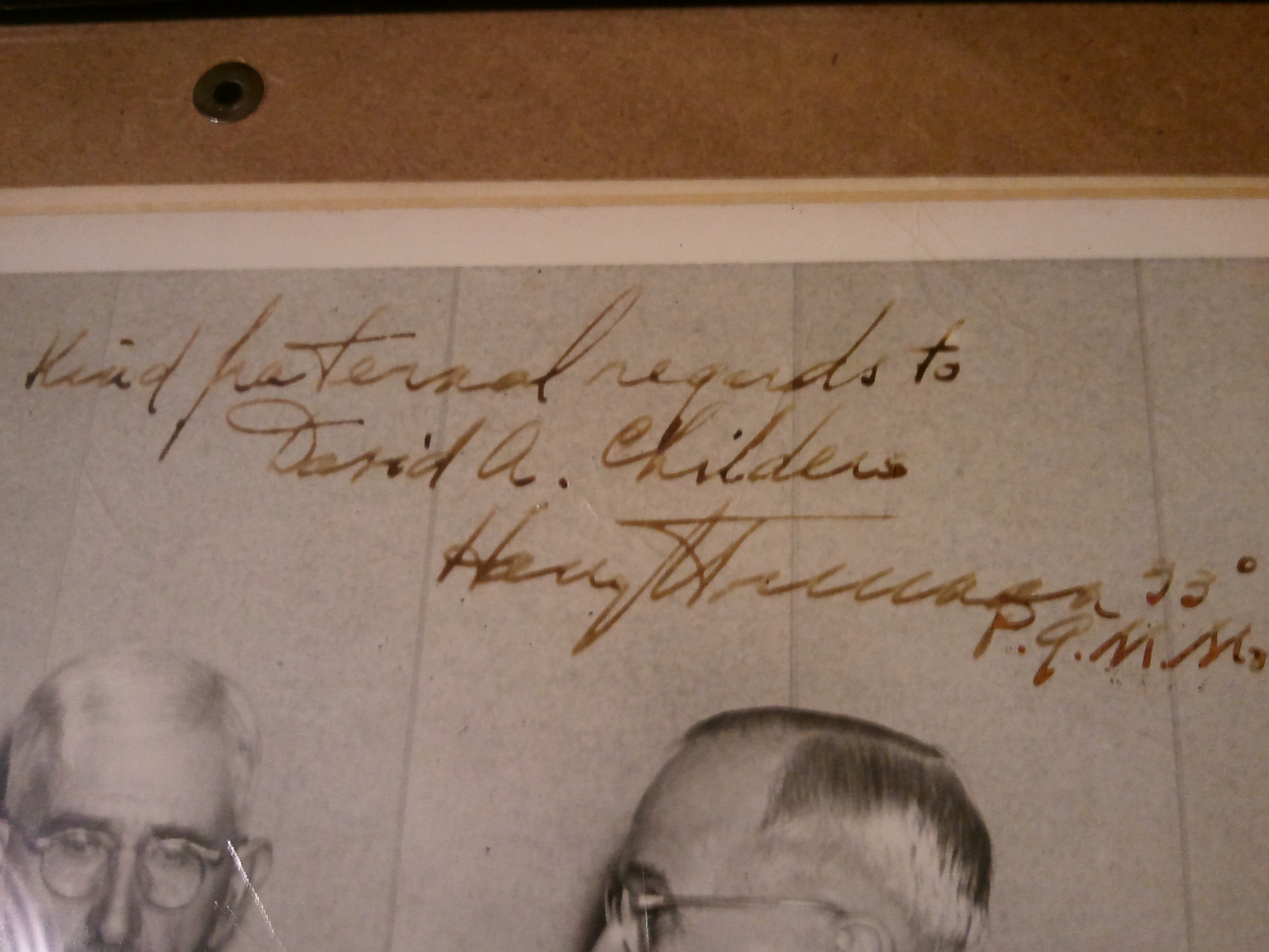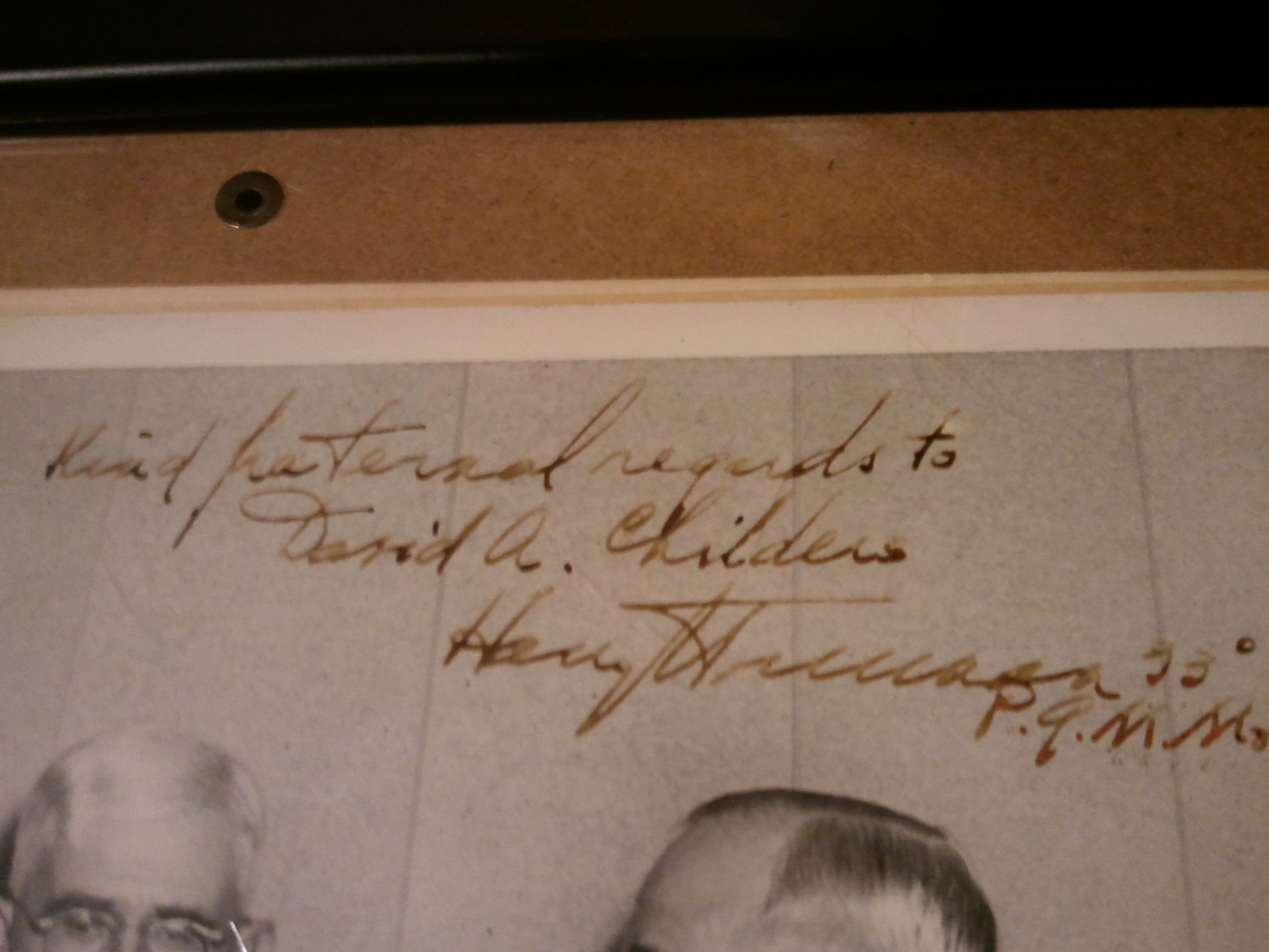 This is origional and shows my great grandfather David A. Childers (on the left) shaking hands with Harry S Truman with a description and signature.