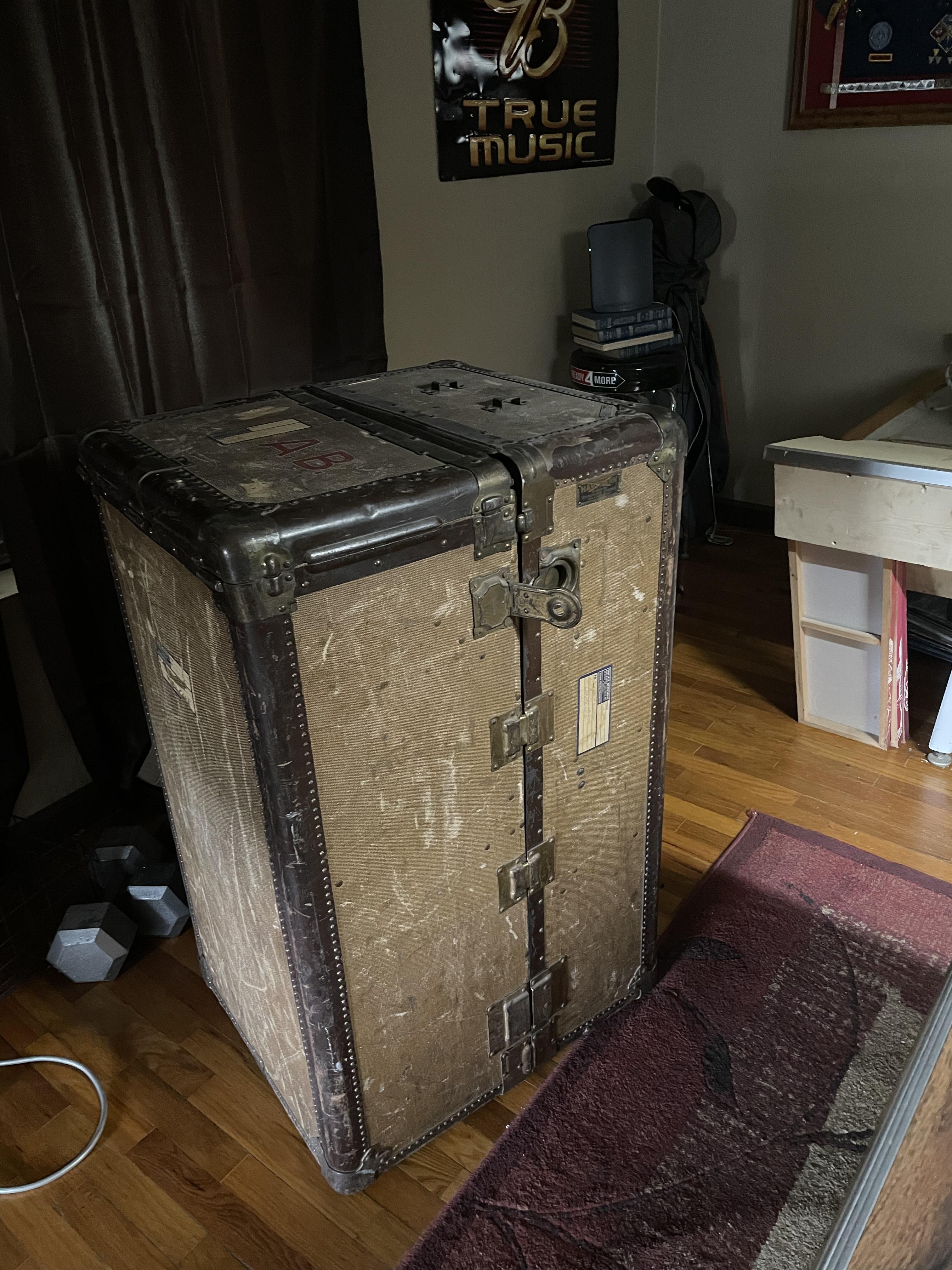 I don’t know much about this piece I found it 5 years ago and just loved it as a decorative bookshelf or corner piece. It’s seems to be all original lock mechanism is slightly damaged but works with no key hole the locking drawer mechanism works as it should and the top locking drawer is still intact but slightly damaged. Canvas is in decent shape some scrapes due to age with only one nickle sized cutout in the bottom/back.