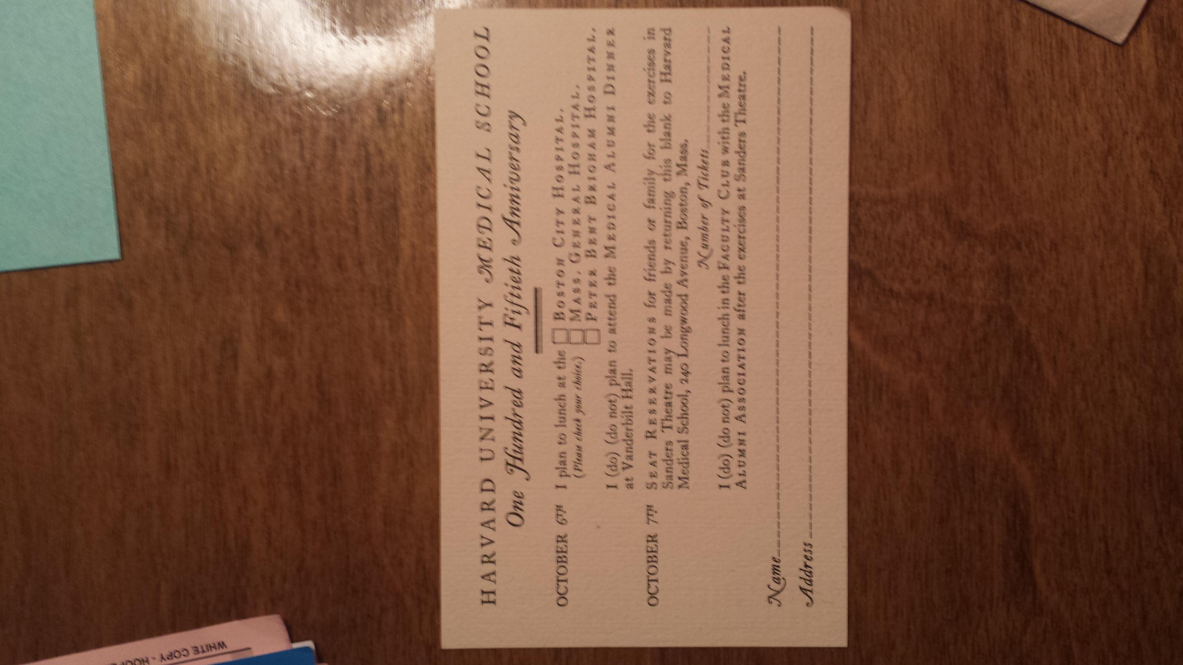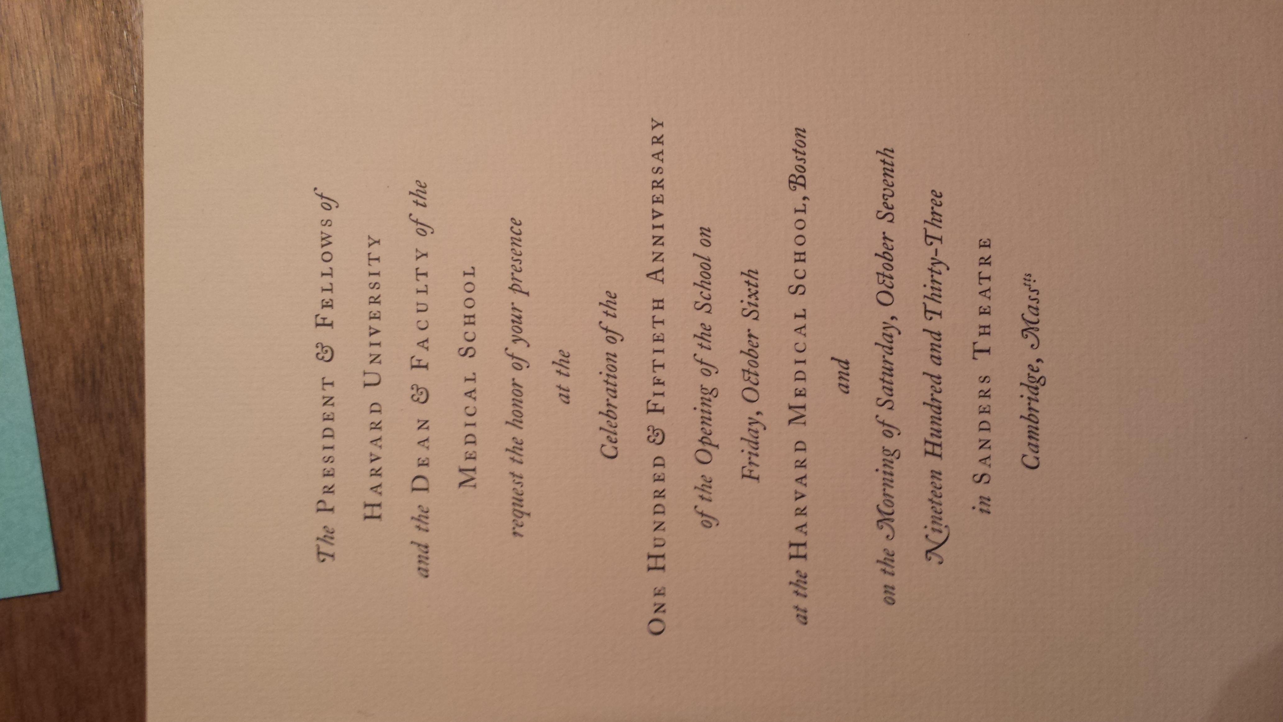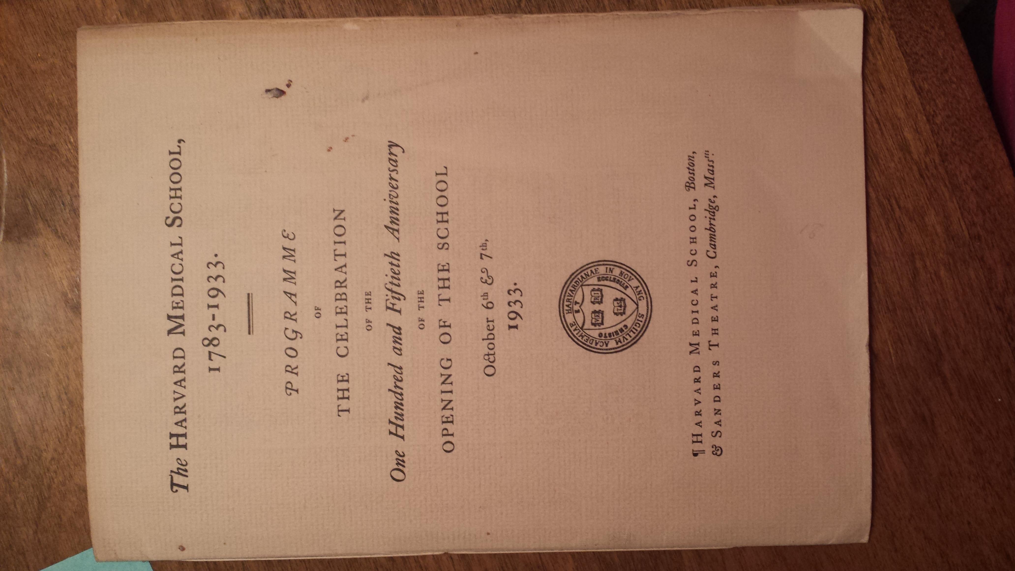 Harvard Medical School Programme of The Celebration of the One Hundred and Fiftieth Anniversary of the Opening Of The School. October 6th & 7th, 1933. Includes the reply card