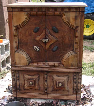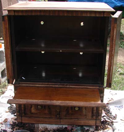 This cabinet was bought for me by my mother to serve as a media cabinet. Whoever had it before painted over the gorgeous wood (painted it black!) and the pictures below are after I had stripped the paint off. There is a picture below that shows what the original finish was, the painters didn't paint everywhere. I intend to simply put a clearcoat over the wood, no staining.