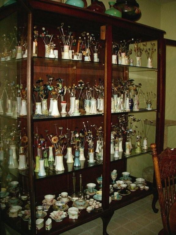 old hutch full of hat pins and hat pin holders,porcelain and china.