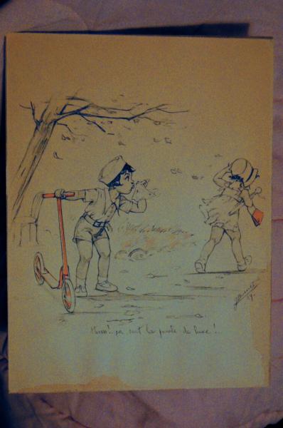 Little boy in shorts outfit with sailor cap, blowing on a handkerchief at a little girl who appears to be walking away. The little girl is wearing a sundress and bonnet, carrying a closed umbrella and a red purse. The boy has one hand on a red scooter. It appears to be windy. There looks like water damage on the bottom and bottom right of the paper. It has what we believe is it's original frame. Any info would be greatly appreciated!!!