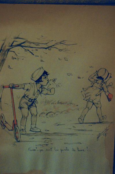 My parents found this in our attic of the house I grew up in. The house was about 80 years old before we moved into it . This pic was hanging in our dining room for as long as I cen remember. I don't know who the artist is or what it's saying. I've tried the online translate sites and it says something about the girl being a big chicken.