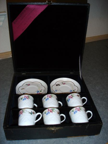 I received this set as a gift. There are 6 cups and saucers with the original storage box. The box is hard case similar to silver cases. It is lined in felt and the satin label inside says, Haviland & Co. Limoges, Paris 1878, patented US Feb. 10, 1878. In researching I do know there was an exposition in Paris in 1878, have not been able to find a list of items displayed by Haviland. In all my research of Haviland I have never seen any sets in the original storage box and I know that usually adds value to antiques. Can anyone give me additional info on this item?