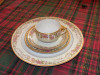 This vegetable or soup tureen is gold gilded and is adorned with small blue and yellow flowers.