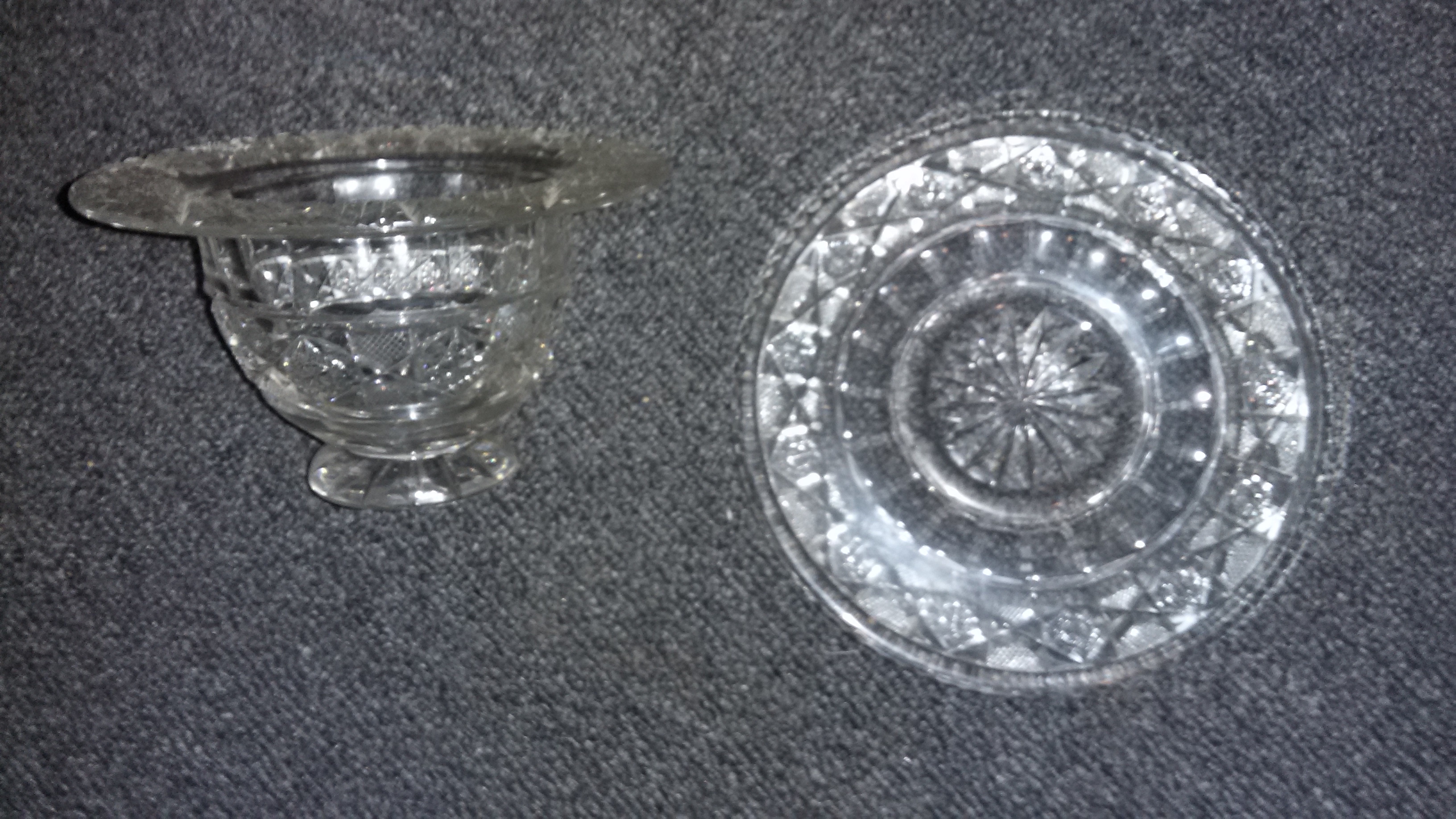 Hawkes signed bowl with matching design plate. No chips just small wear at the base. The Hawkes signature is very faint on the bowl. Could not locate it on the small plate.
