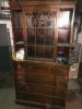 This is a footstool sized sewing box. It's made out of wood with Art Deco style dark wood legs and gold plating at the bottom of the legs (or maybe gold paint?). It has a foam padded top and the outside upholstery is made of a imprinted green vinyl. The lid opens and the lid is lined with tan satin which has two pockets sewn into the interior. Also the inside is open with a small 5 inch shelf. The inside is painted a green shade slightly darker than the outside color. There is a plastic gold trim around the top and bottom, and the two handles are in great condition - except the left is kind of loose, and just needs to be tightened. The hinge that holds the lid up is slightly bent and scrapes against the wood on the inside and has pulled off some of the paint, also making it harder to lift, but it's not really that bad. It's in really great condition, and I absolutely love it!