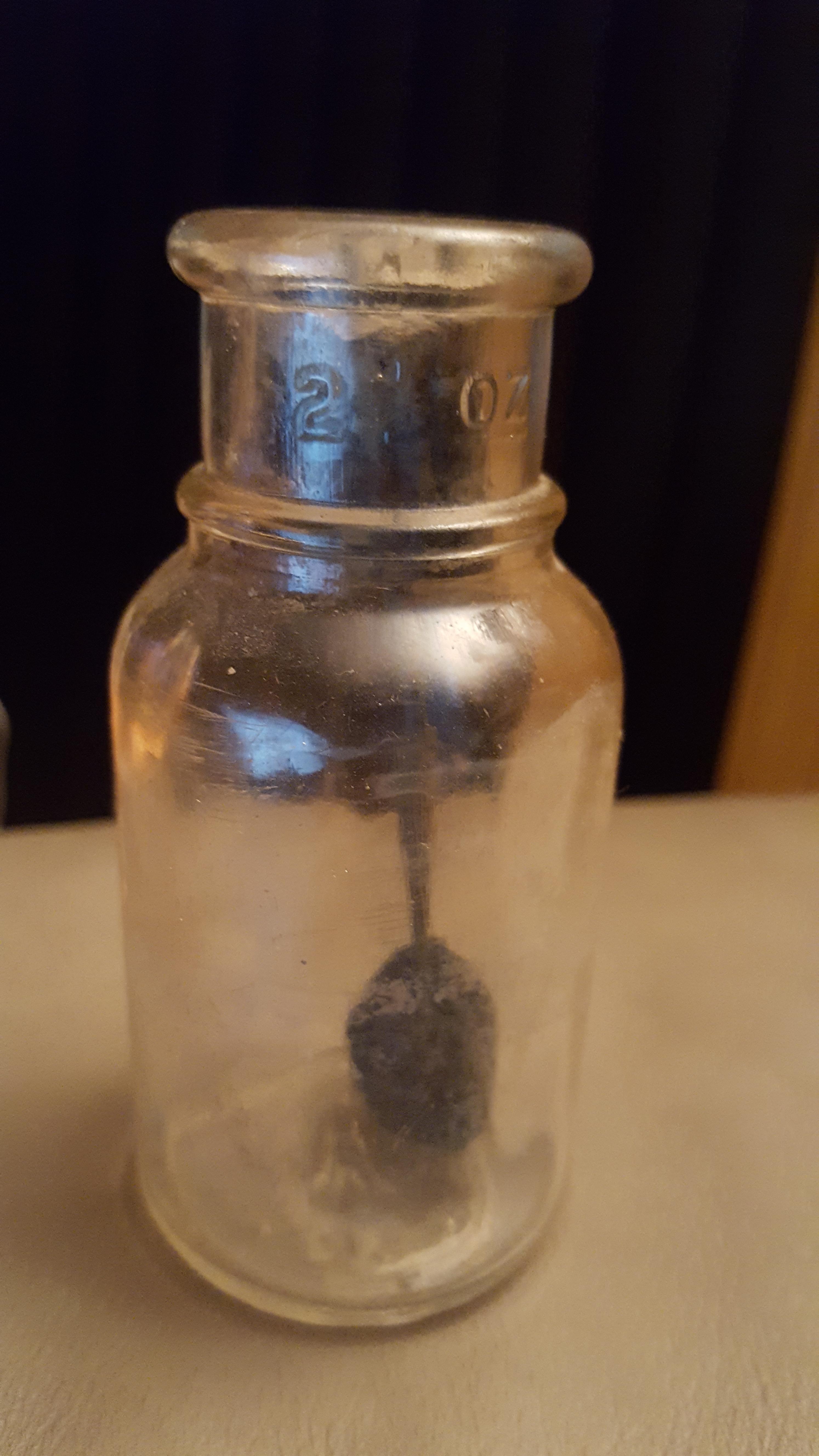 The bottle is 3 to 4 inches in height, the bottom is embossed with the HA for hazel-atlas and the numbers 2K-5862, the rim of the bottle is embossed with 2 1/2oz. Also has the original cork topped dabber in it. In very good shape for its age.