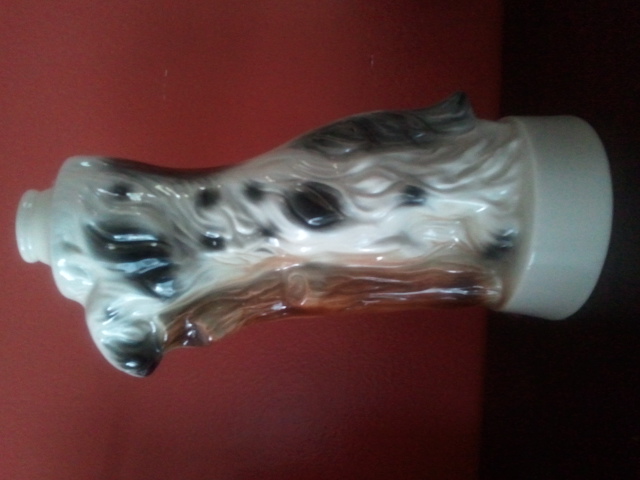 It is a 1' fluffy headless dog ceramic/like vase. The dog is white with black spots on it including a black tail and black on the paws. It is on its hind legs resting on a brown tree stub or stick like object. At the bottom of figurine it says James B. Beam Distilling Co.