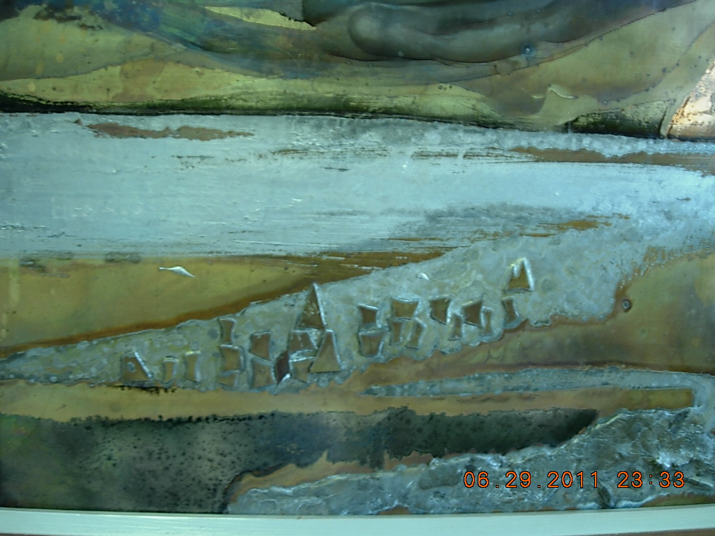 This artwork is very smooth for working with melted metal. It has a couple of areas that are mosaic work. puposely representing rock and shoreline. The Heaton in the signature is clear but the Cooper is mostly the