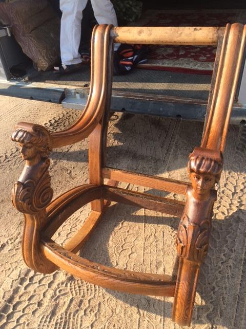 Purchased at an auction without runners or upholstery, this rocking chair with it's deep carvings, seemed worth saving. So we had new runners attached, and are working on upholstery. The problem is, we can find nothing even similar to this chair to guide us. We would love to have an idea of how it was upholstered, it's approximate age and worth, and even a possible place of origin. Thanks.