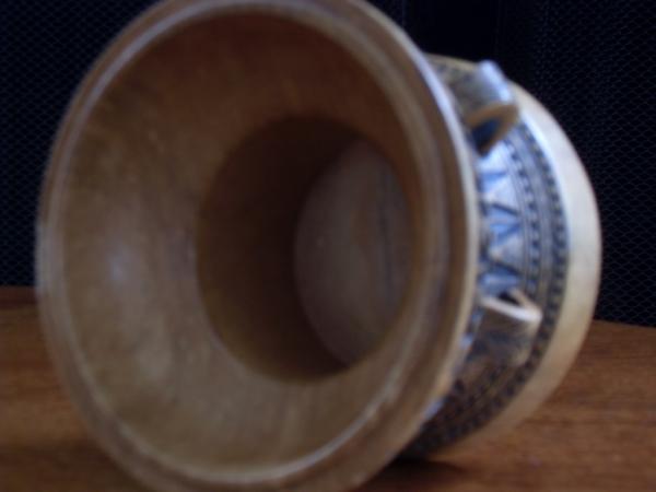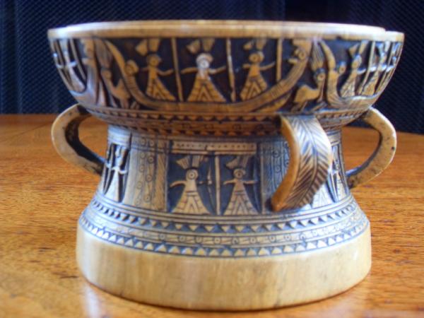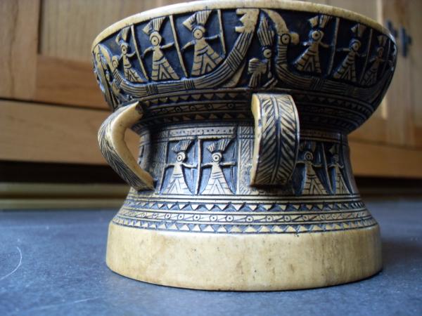 Heavy stone bowl or vessel with 4 handles. Hand carved low relief of Incan?, mayan? figures of three holding spears?(as pictured) in series of boats with additional series of uniform geometric patterns as borders. Color is mostly acurate with deeper saturated gold with dark black painted? areas. Inside consists of smooth surface and appears to have been turned on a lathe with subtle perfectly round circular pattern formed on both sides and bottom with a small pin dot closed area on base. Really neat geometric carvings appear to have been done by hand. Overall weight is about 2 pounds. Any info as to what this is would be appreciated as I cannot find it on the internet. Thanks.