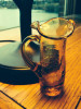 This very thick, heavy tangerine or orange blown glass with a darker orange or possibly ruby swirl in it. Pieces are asymetrical but the bottoms have been professionally ground