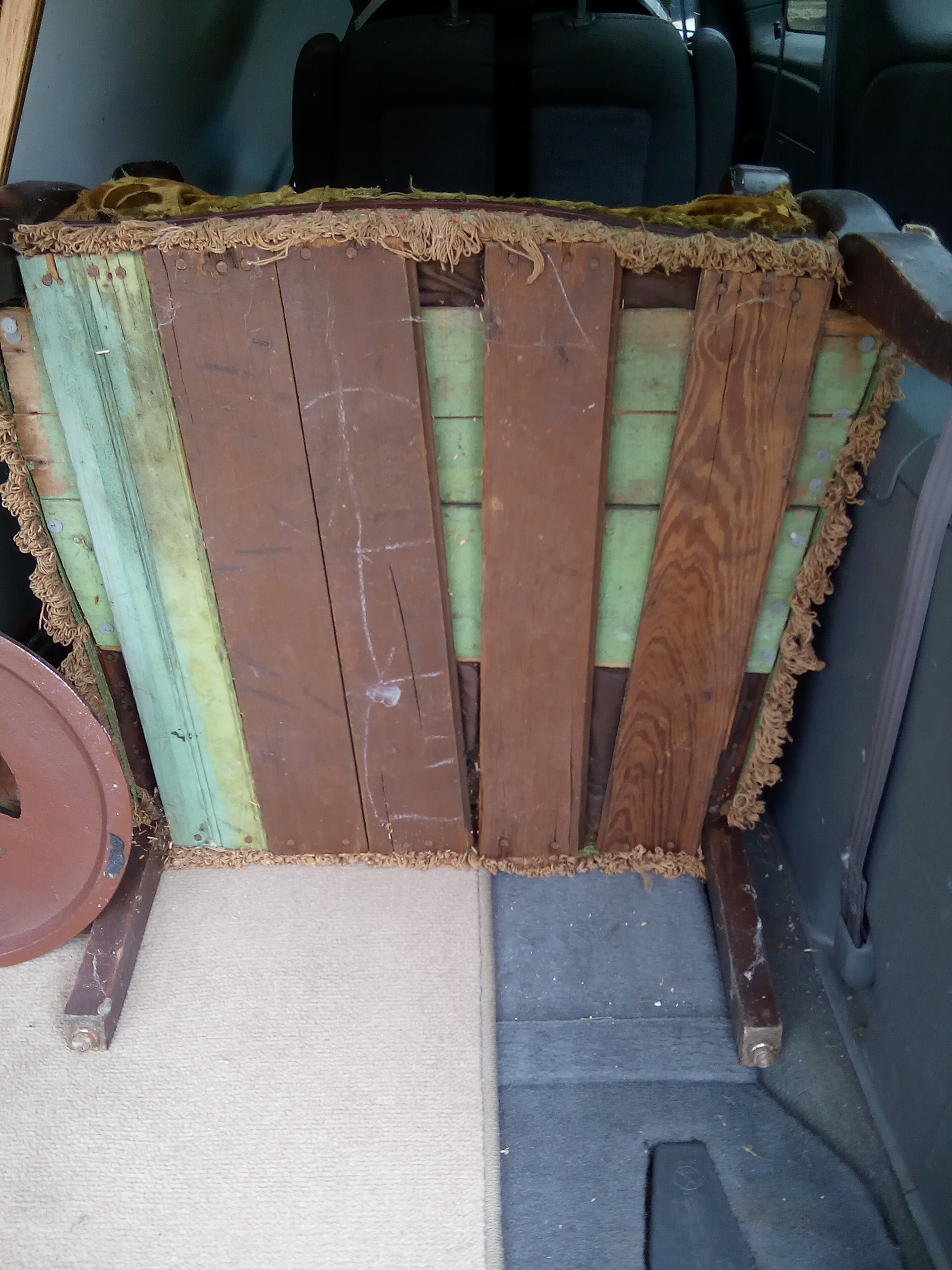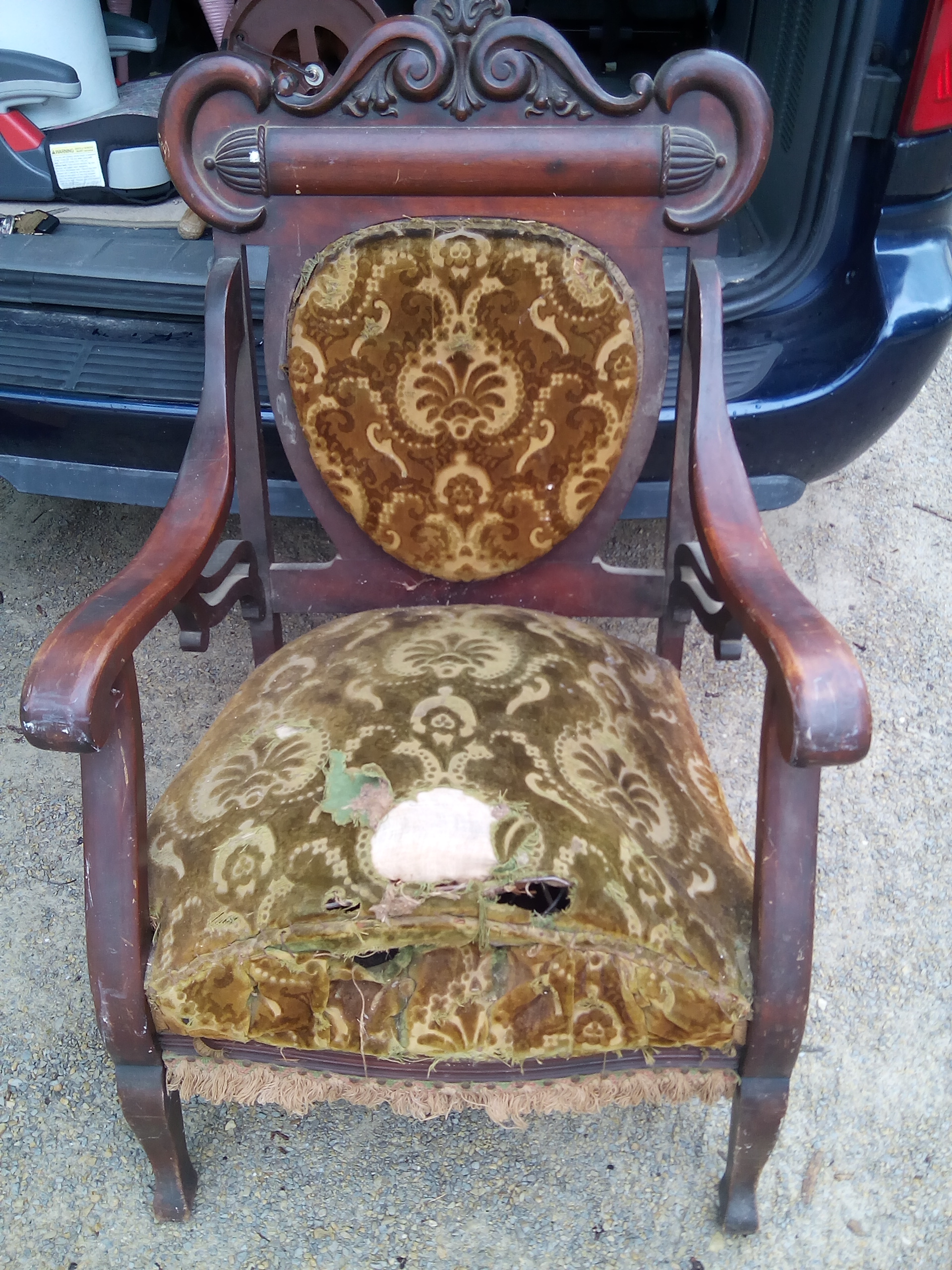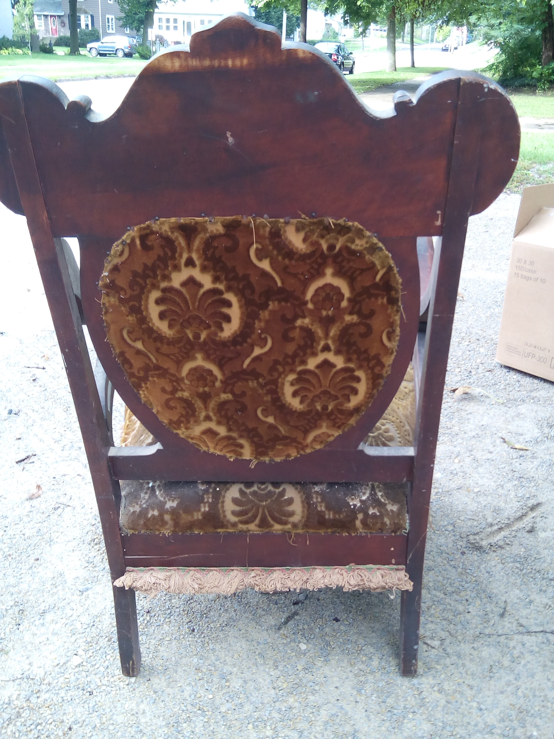 I got this chair to redo it but before I do i want to see how old it is. The rest of the chair is in great shape. Just the seat cushion needs to be redone. It looks like the cushion has springs with a small feather cushion on top. In between the springs it looks like it's stuffed with burlap and some sort of black stringy type stuff. The upholstery is nailed in with small round nails. The joints of the chair are in place with wooden pins. The chair doesn't have any markings that I can see without taking off the cushions. I'm not good with woods and stains so I'm not sure what it's made of. But it is very heavy. The upholstery makes me think 50's or 60's but I know it could've been re-upholstered. Any info would be great.