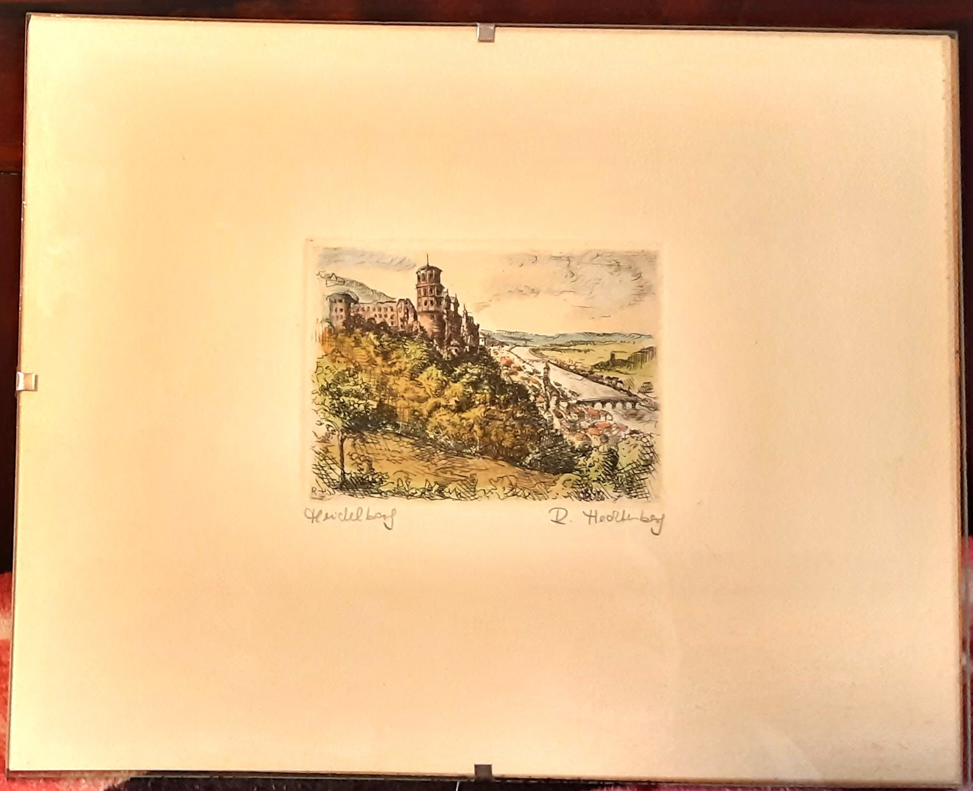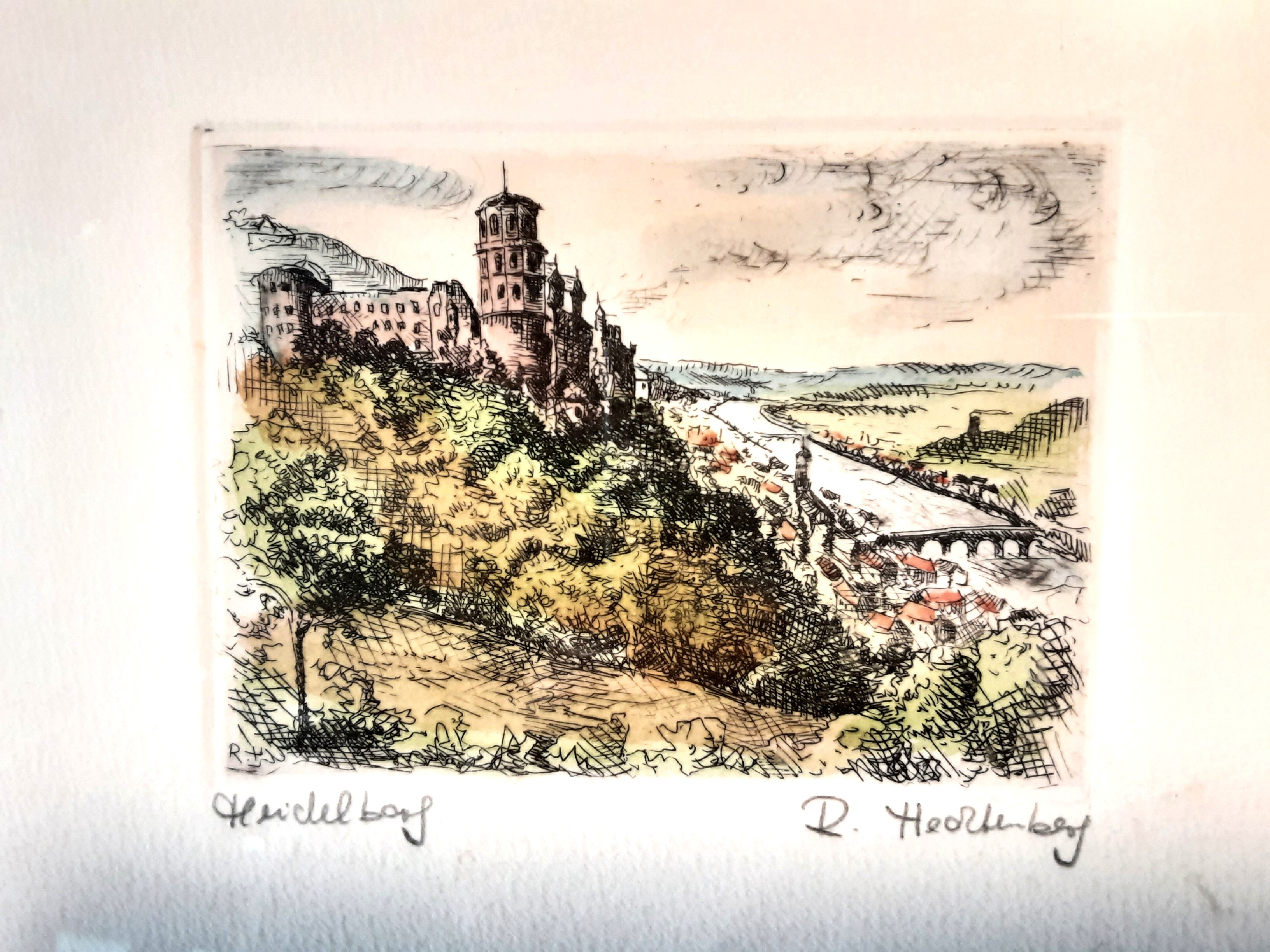The etching is signed by the artist, though only for the place name and not the artist name. So signed in both lower corners Heidelberg and R.Heidelberg (likely Rhein Heidelberg). I suspect that the artist is Ernst Geissendorfer, but not sure.