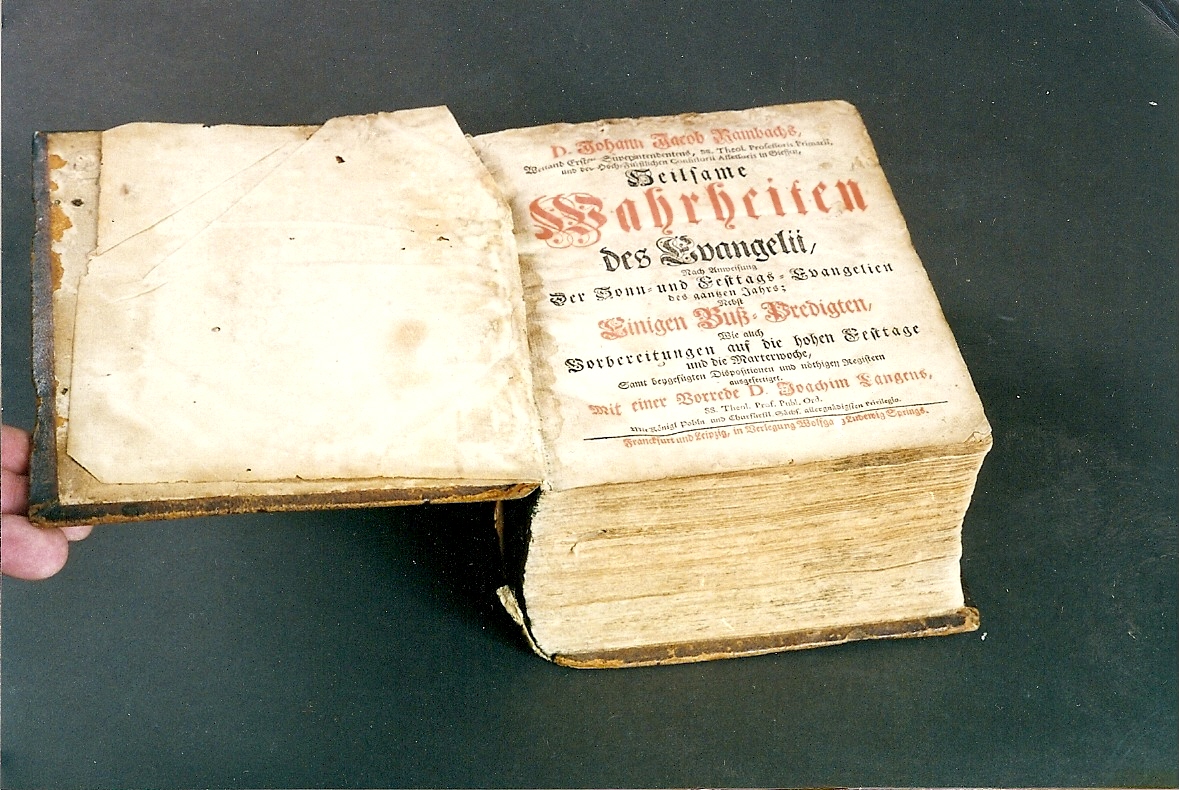 My family is in possession of one of what is believed to be only a handfull of original books : "Heilsame Wahrheiten"(translation):"Healing & Truths", by- D. Johann Jacob Rambach 1693-1735.The book was found by me at the age of 9.The book was carefully hidden in the attic of the first house we moved into in 1968.I don't yet know why.. but clearly someone went to a lot of trouble to hide this book,that only a child's curiosity could find.