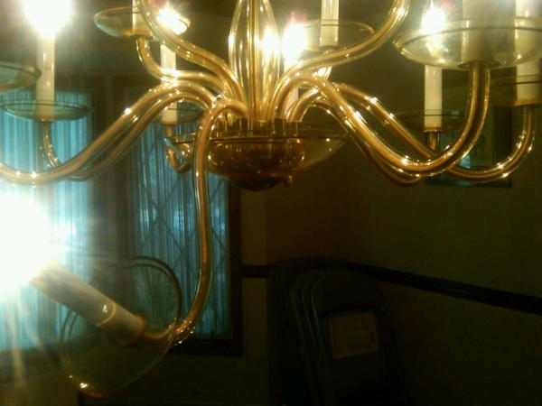 Gold tone Heller chandelier (now has broken arm which will be repaired),. Hanging in my dining room for 30 years. like new.
