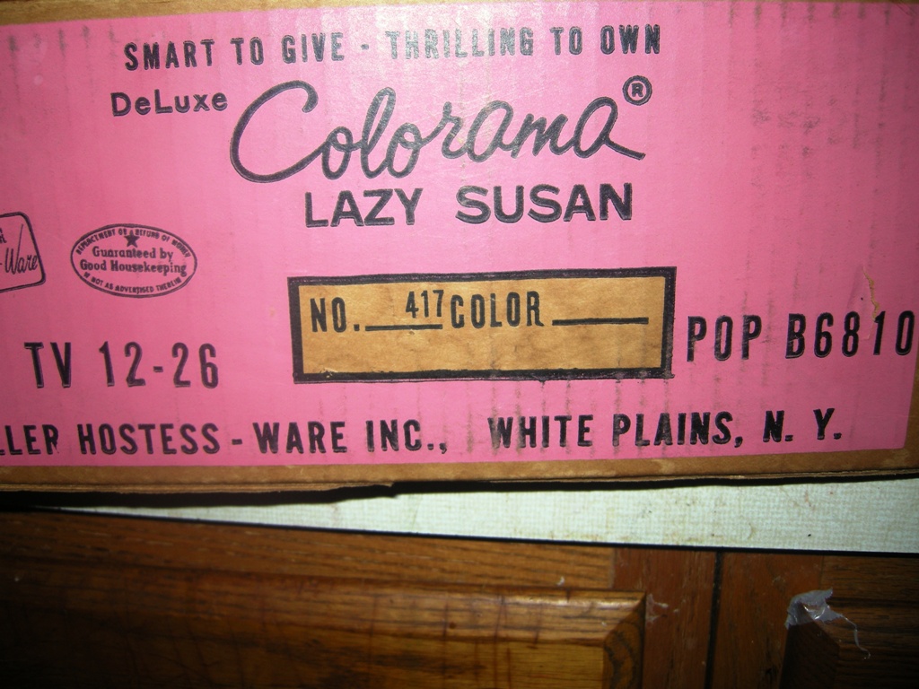 I have a mint Heller Hostess-Ware Deluxe Colorama Lazy Susan in the original box. Box says Smart to Give - Thrilling to Own Deluxe Colorama Lazy Susan No. 417 Heller Hostess Ware Tv 12-26 POP B6810 Heller Hostess-Ware Inc. White Plains, N. Y. Guarateed by Good Housekeeping, Top of box has printing on it that says "Serving the Nations' Industries" Industrial Container Corporation Certificate of Box Maker(?) and somemore writing....underneat the circular seal it says ICC and then 1957, and under that 417, then there's a "Ship To" section. The product itself is a beautiful red aluminum lazy susan tray, with four white glass sections that sit around a white glass bowl in the middle. The white glass bowl in the middle has a red aluminum lid on it. I have inspected all the parts and they are all in mint condition. I'd like to find out how much this heirloom is worth.