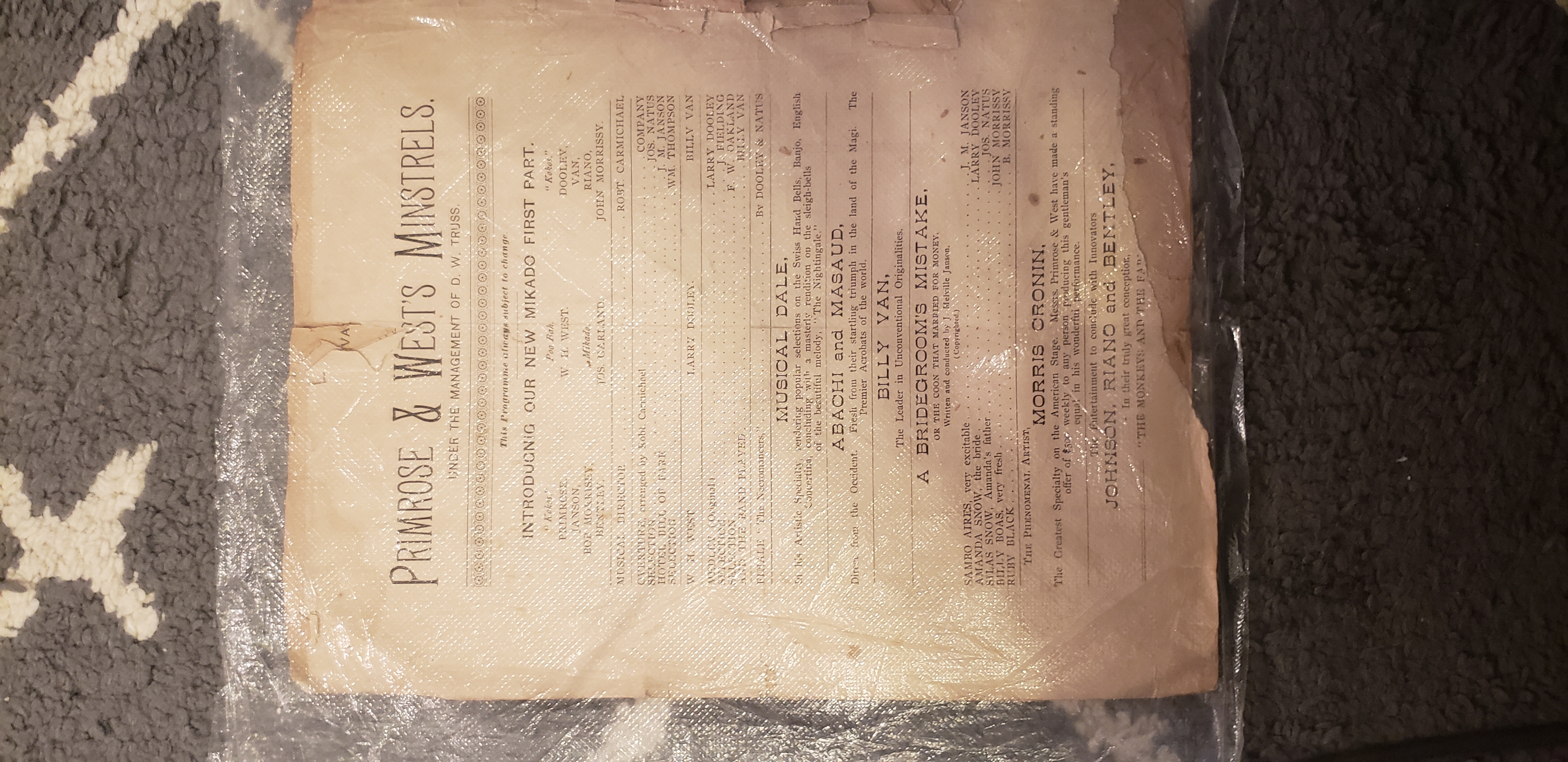 I have attached a photo of the front and the back of the program for your review. From what I could find. I dated it about 1870, obviously by The famous minstrel duo "Primrose and West". From what saw online they were pretty famous/controversial.