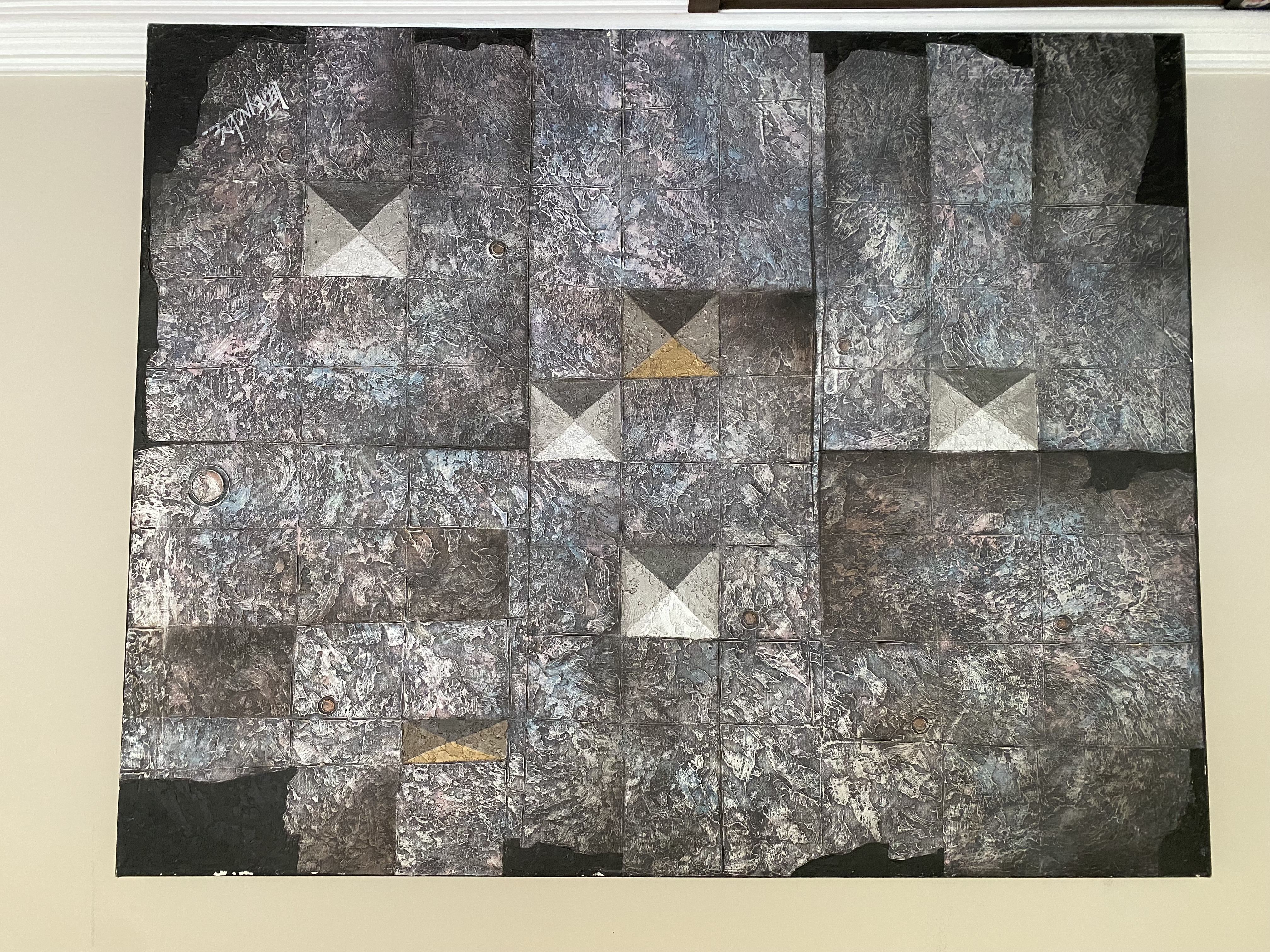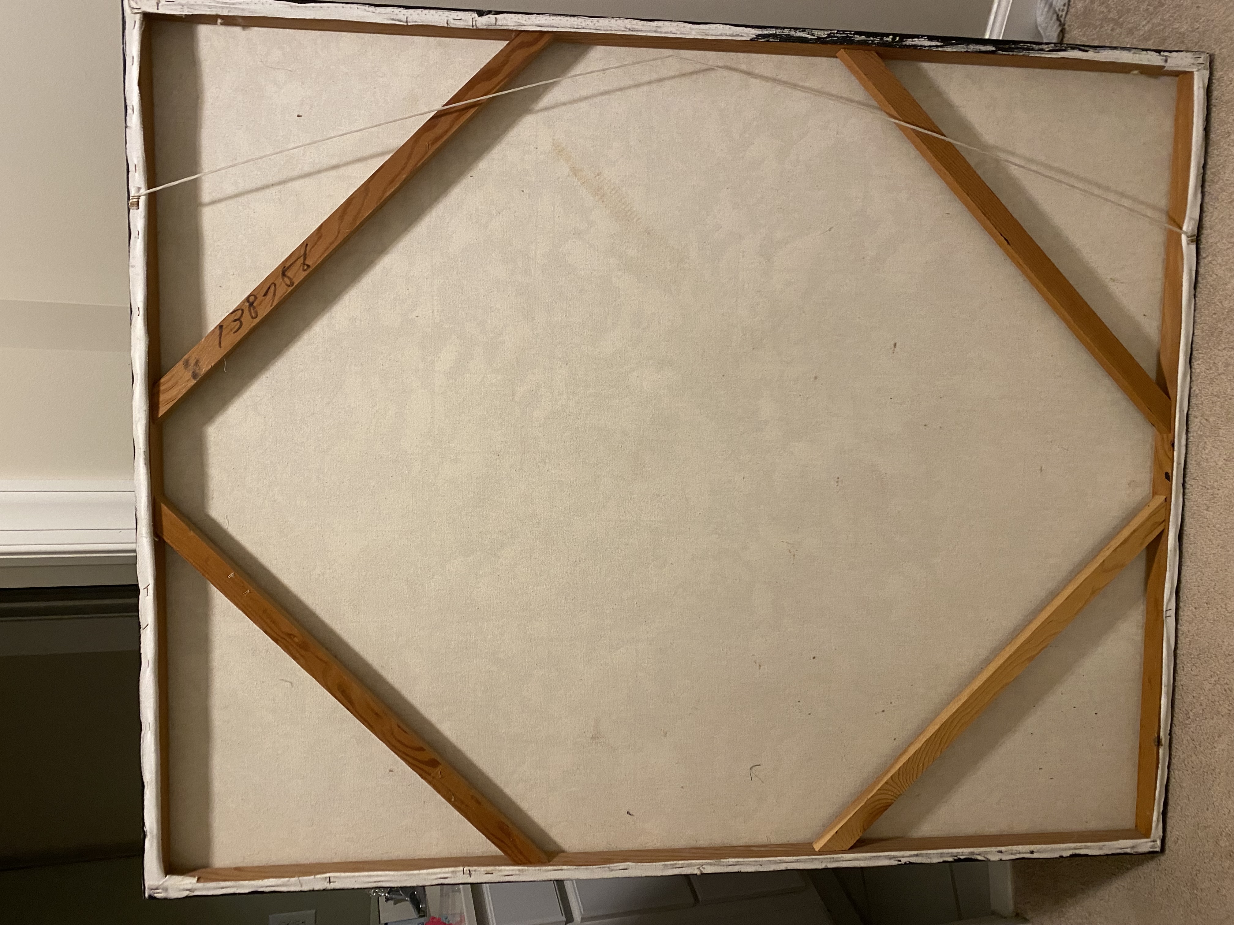 The building I used to work at has been there since the late ‘50s. Nobody knows anything about this painting or how old it was. They didn’t want it anymore so I gave it a home. It’s signed “Lee Reynolds” and the back is numbered #138756(?). It has lots of texture and is about 4ft x 3ft.