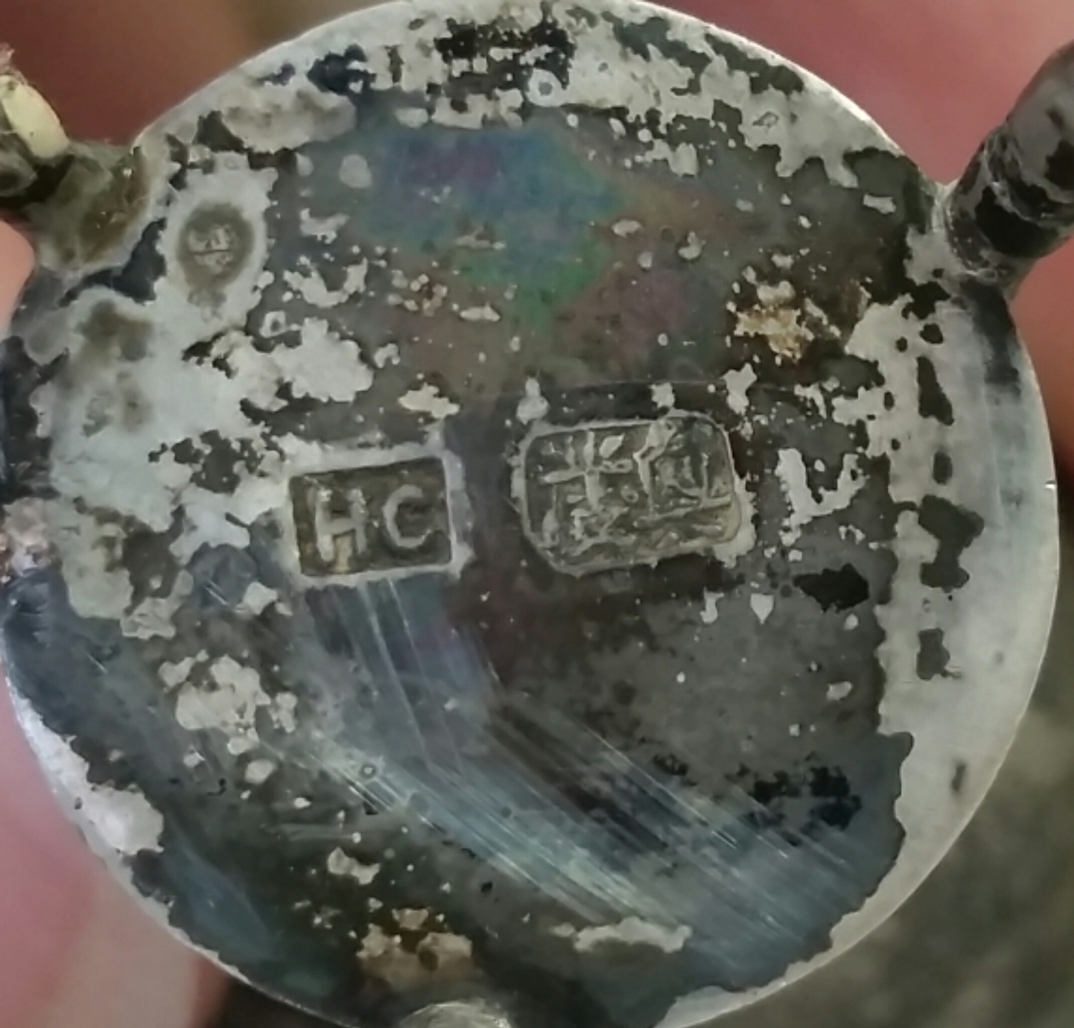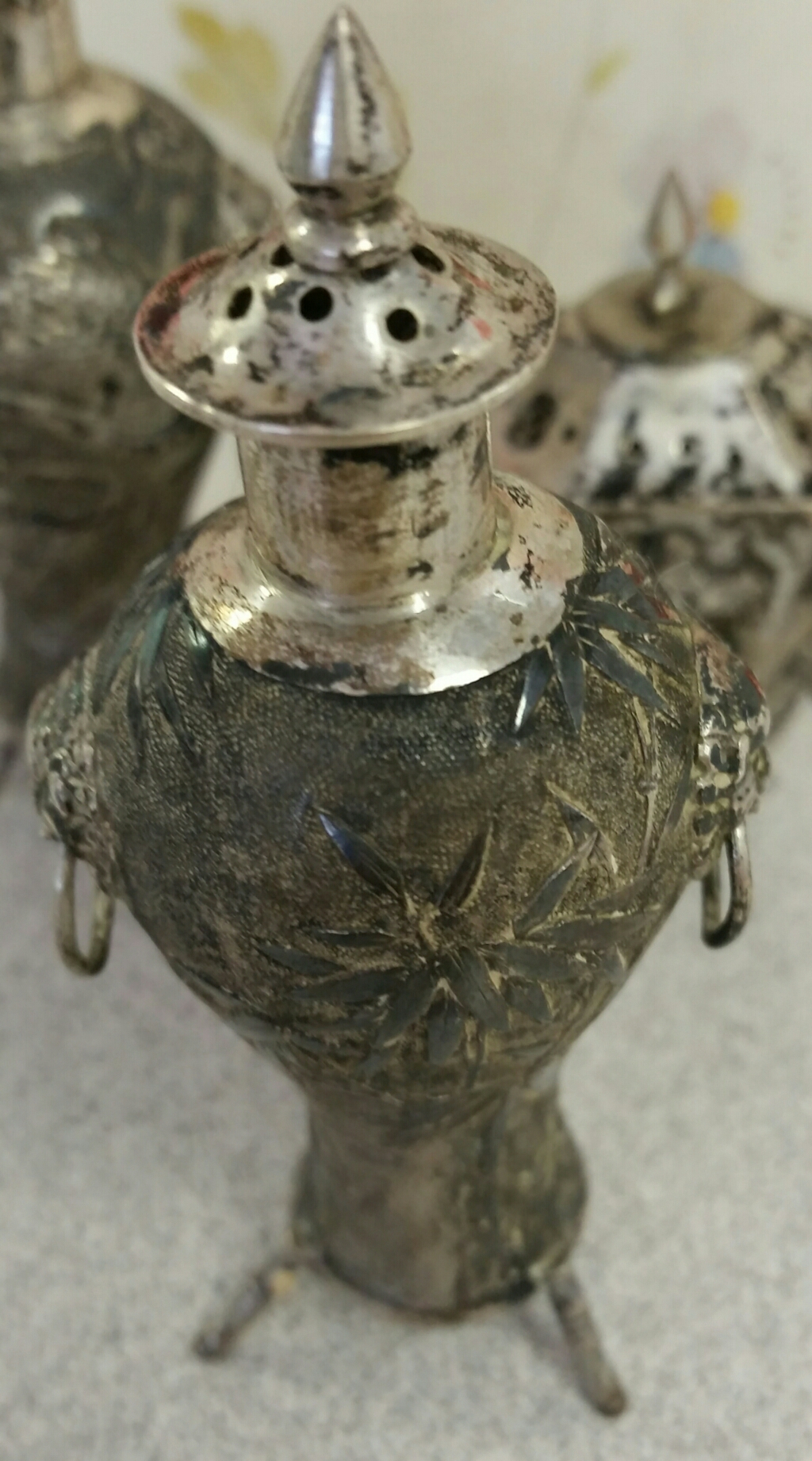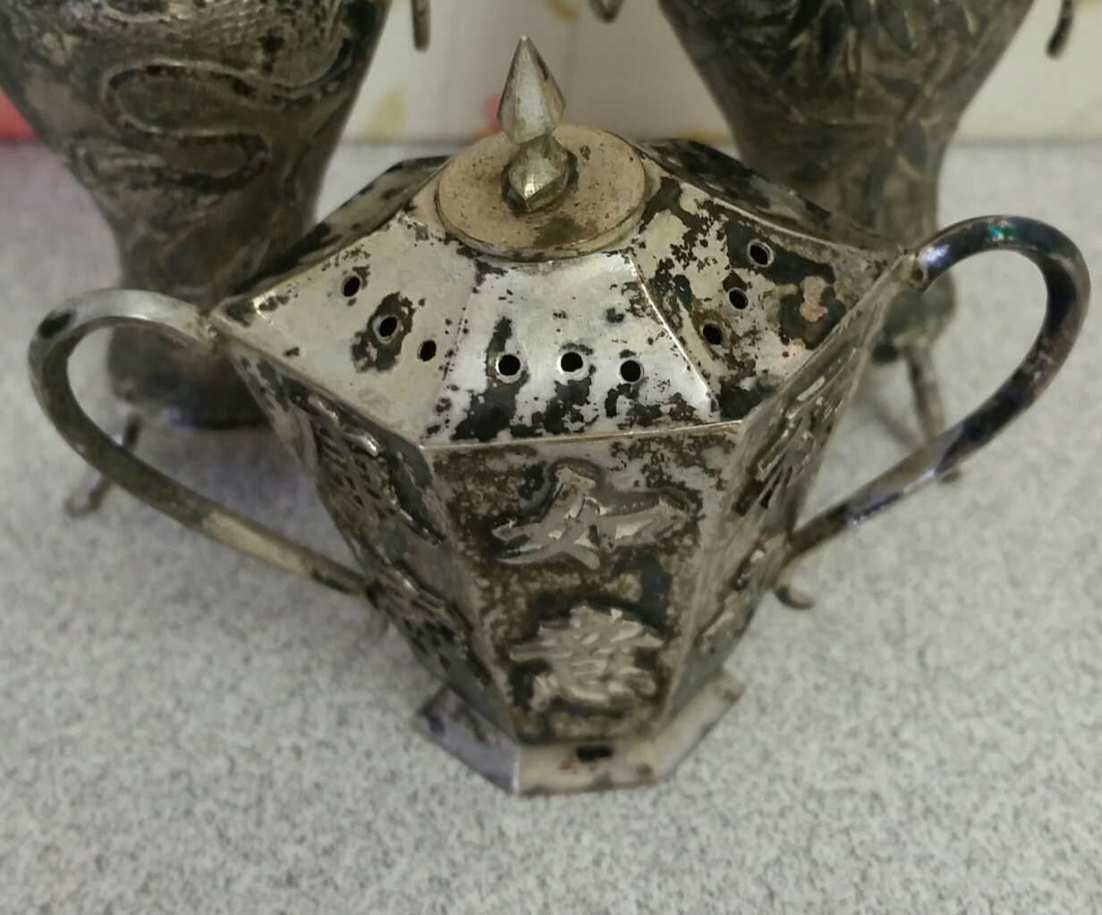 I know that they are dirty and am hoping I will be able to polish them. But wanted to take pictures and try to figure out what they are first. All three of the shakers have the same writing on the botom but the two are so small and tarnished that I could not picture them, so i just pictured the one. I think that the writing is in chinese but again I'm not 100% on that.