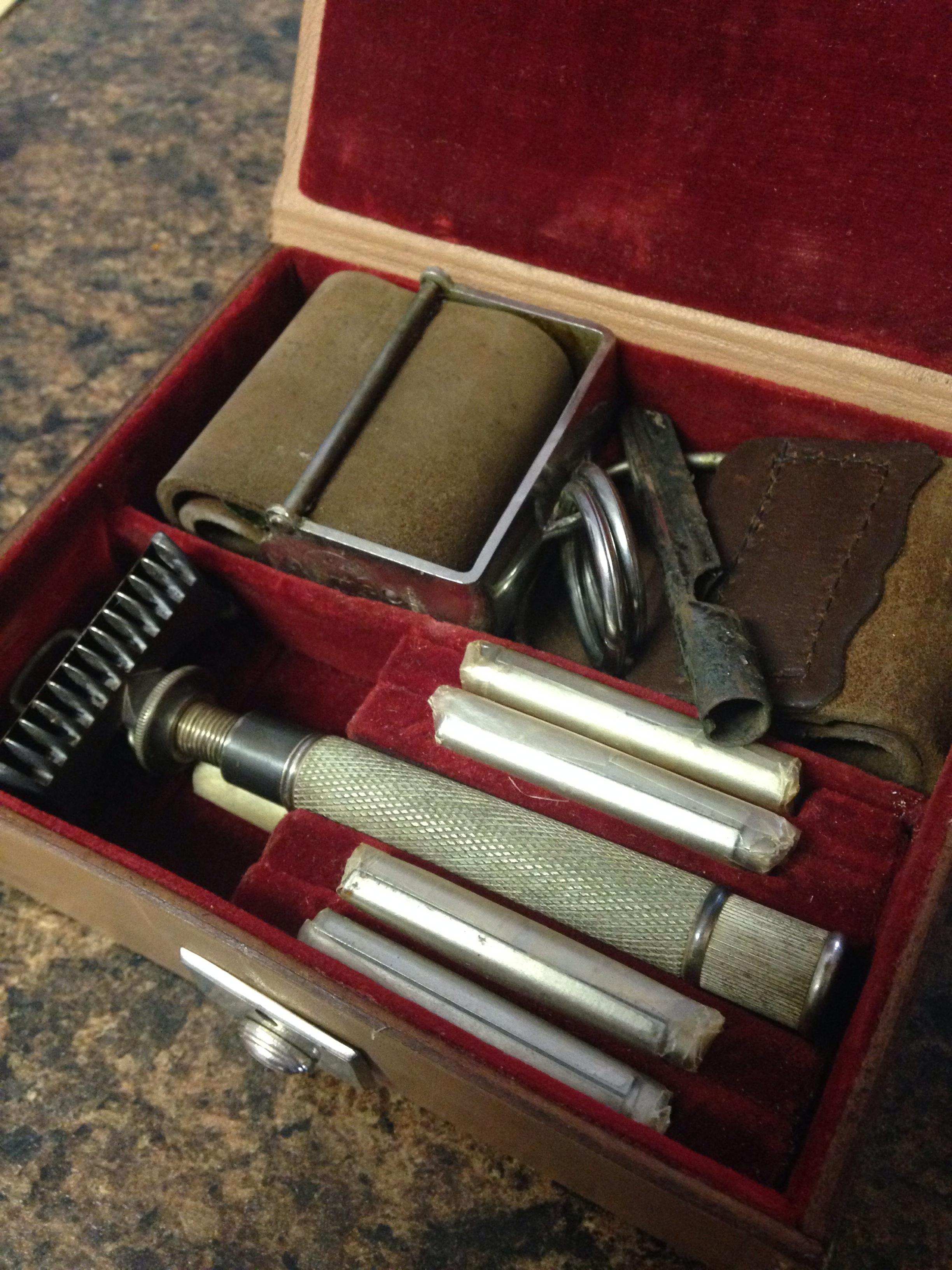 Henckels twin works rapide razor. Leather case in very good to mint condition, comes with original box, the 4 blades that are holstered in the case are still wrapped in plastic, the stropper bar is still wrapped in paper, stropper blade holder shows some wear along with the strop, razor in good condition with nice patina and a blade inside the razor. Comes with a folded paper instructions on how to use the razor and the strop.