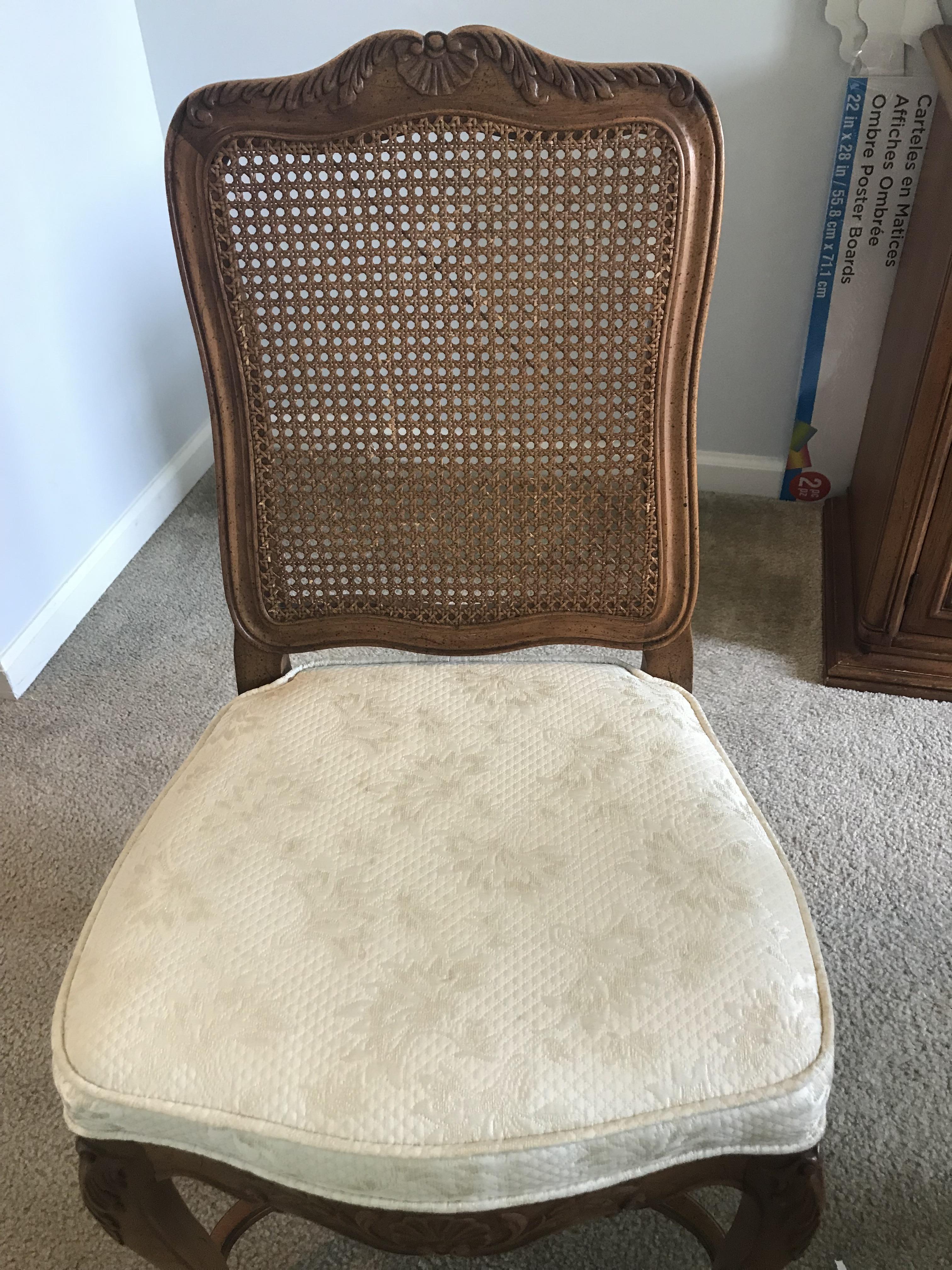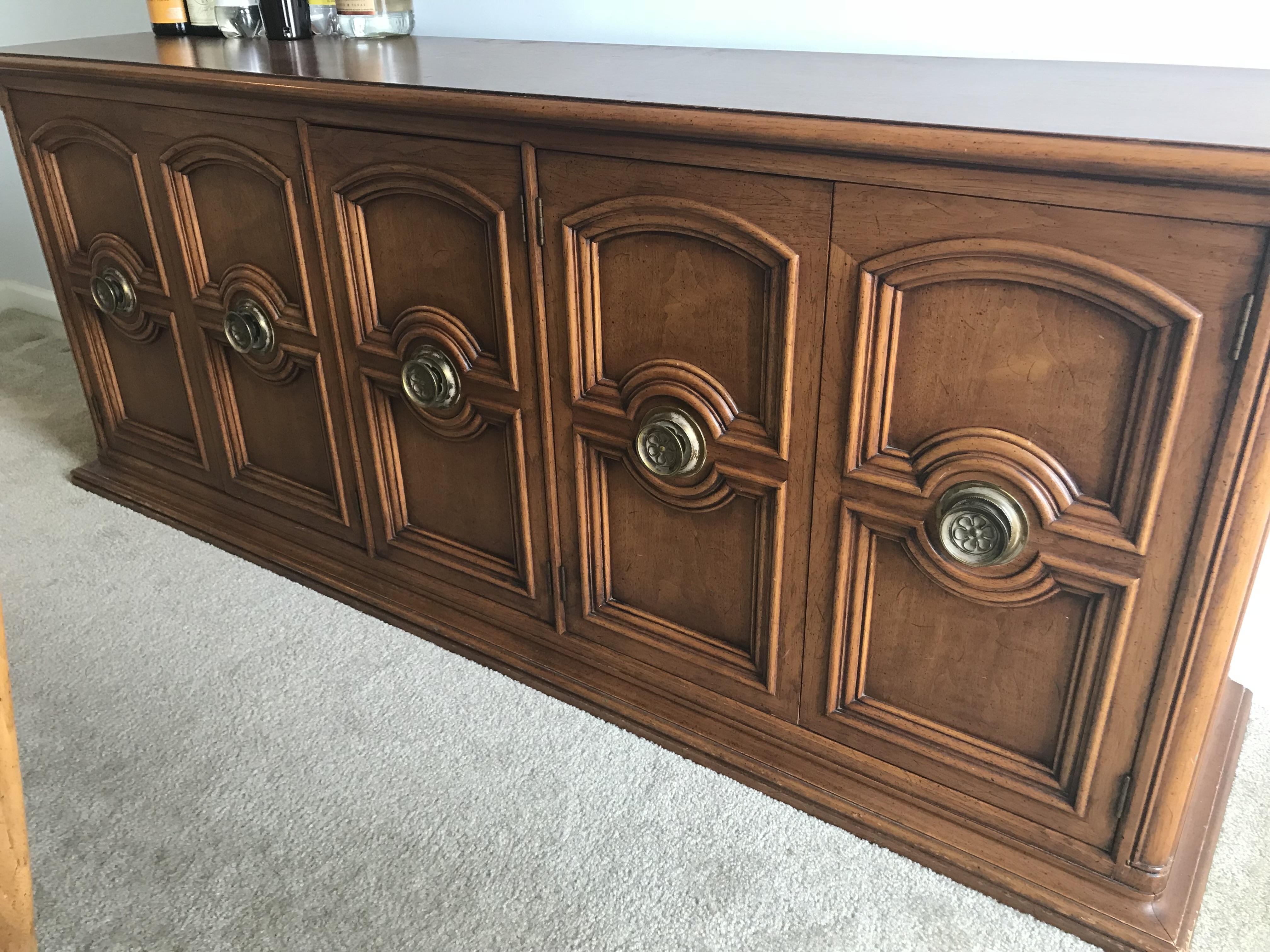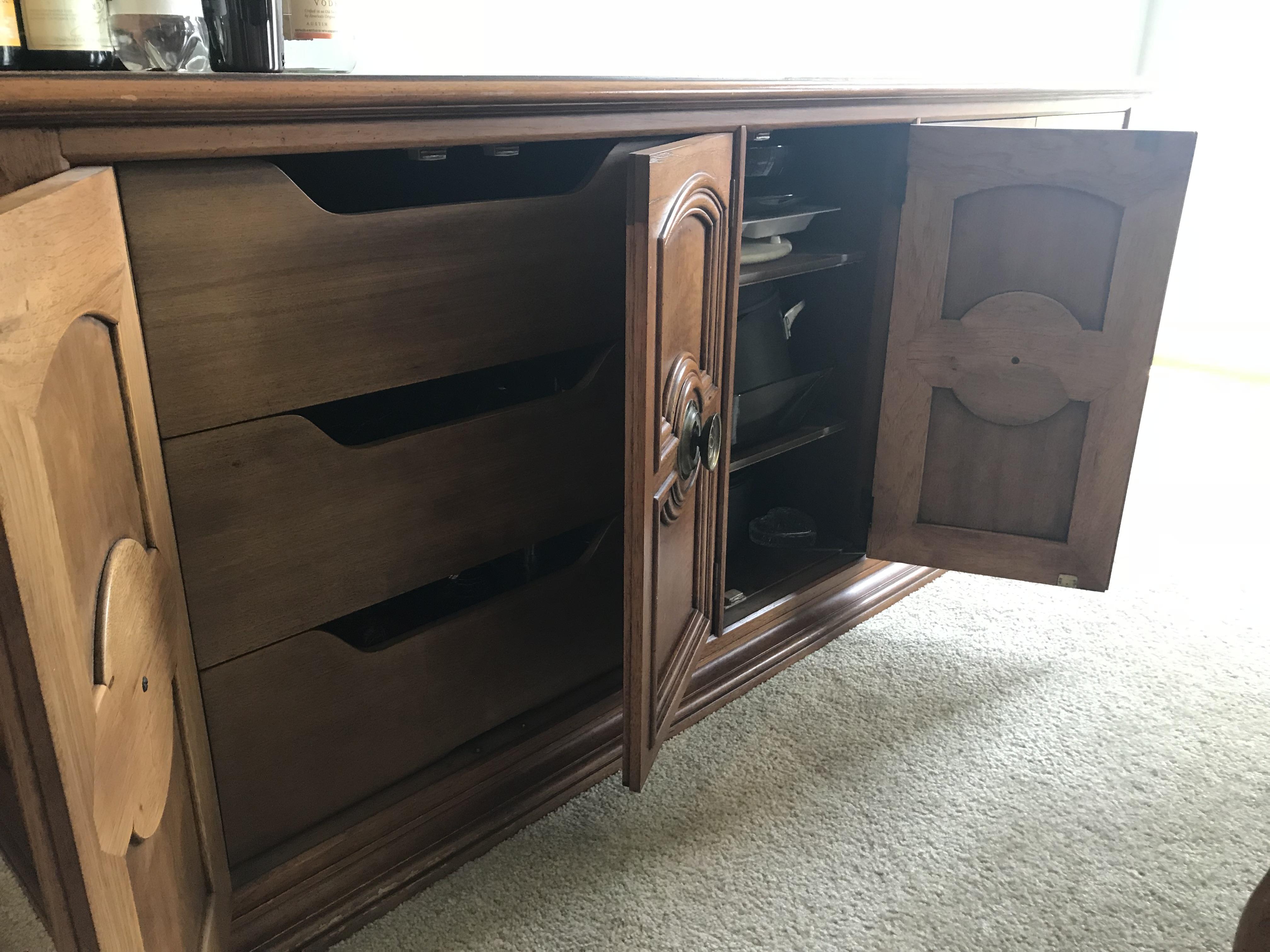 Henredon furniture 1970s dining room set. Hand crafted dining room table, chairs and buffet. Intricate carved table legs and chairs. Unique weaves chair backing. Buffet piece has three main storage areas with drawers and shelving. Still is very good condition.