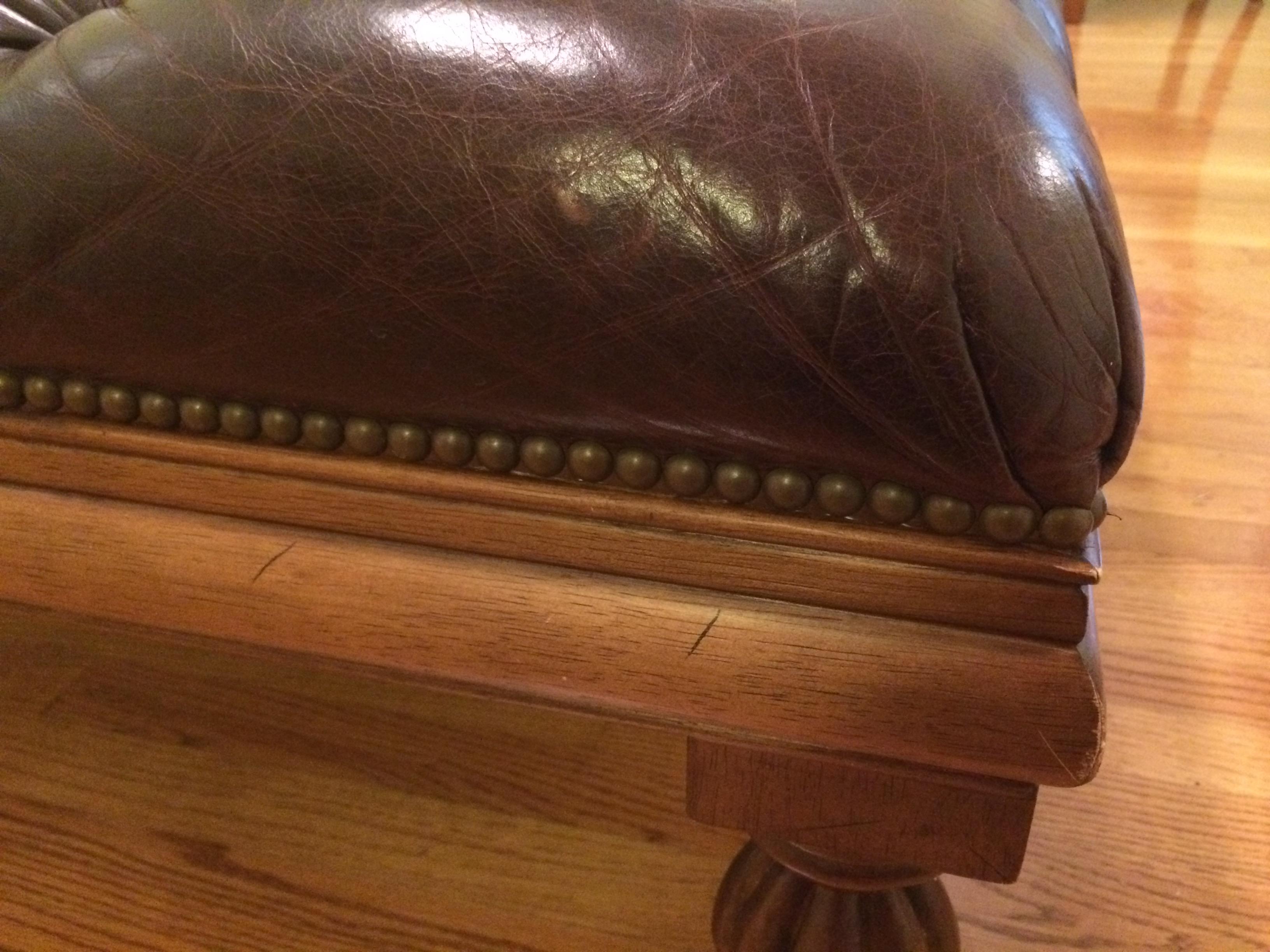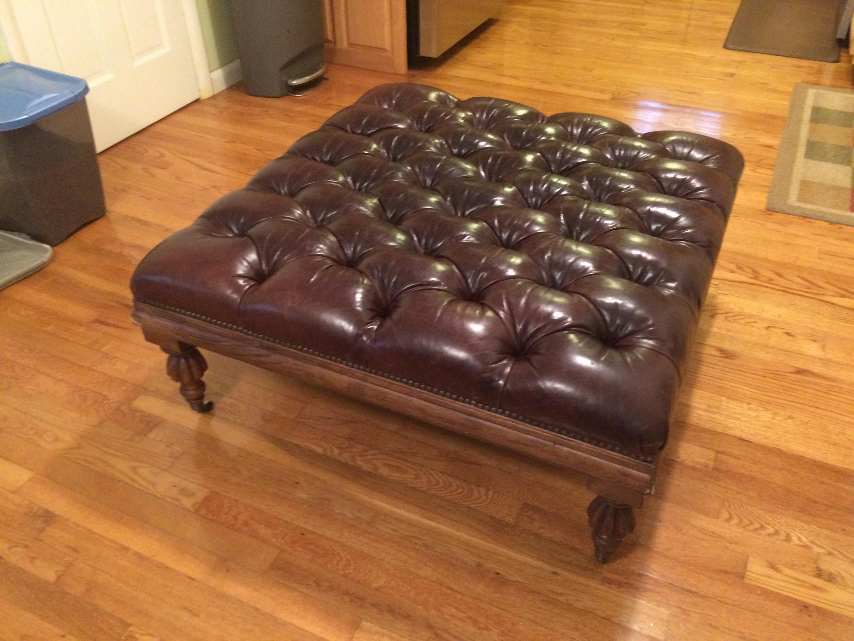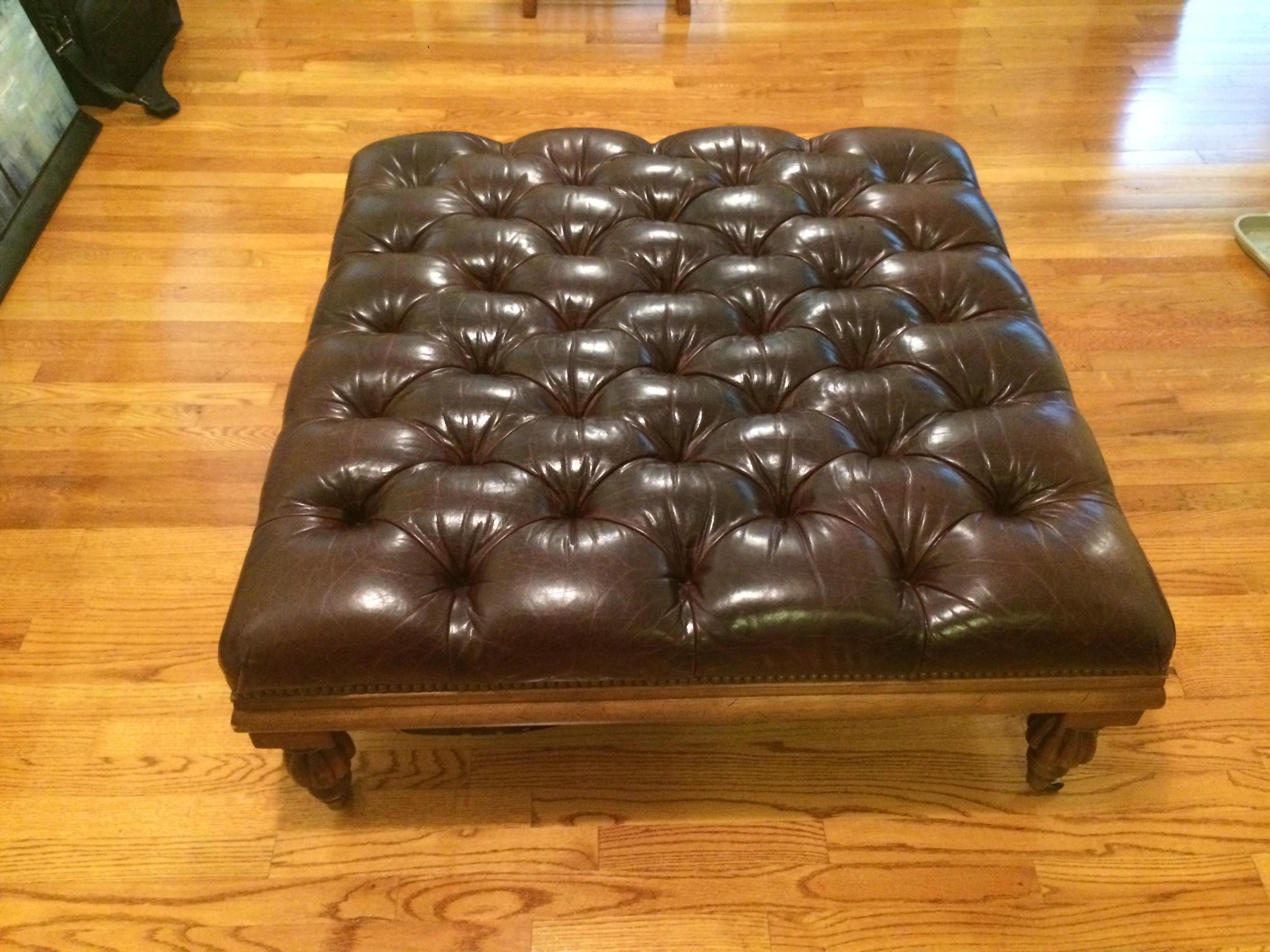 Henredon Tufted leather Ottoman. ca. 1970. I have seen similar pieces selling in the 600-1500 range depending on the condition, the leather on this one has no holes or cuts. One foot is slightly bent and there are some scratches on the wood finish as seen in the pictures. I have no history on this piece. It is 40 inches wide.