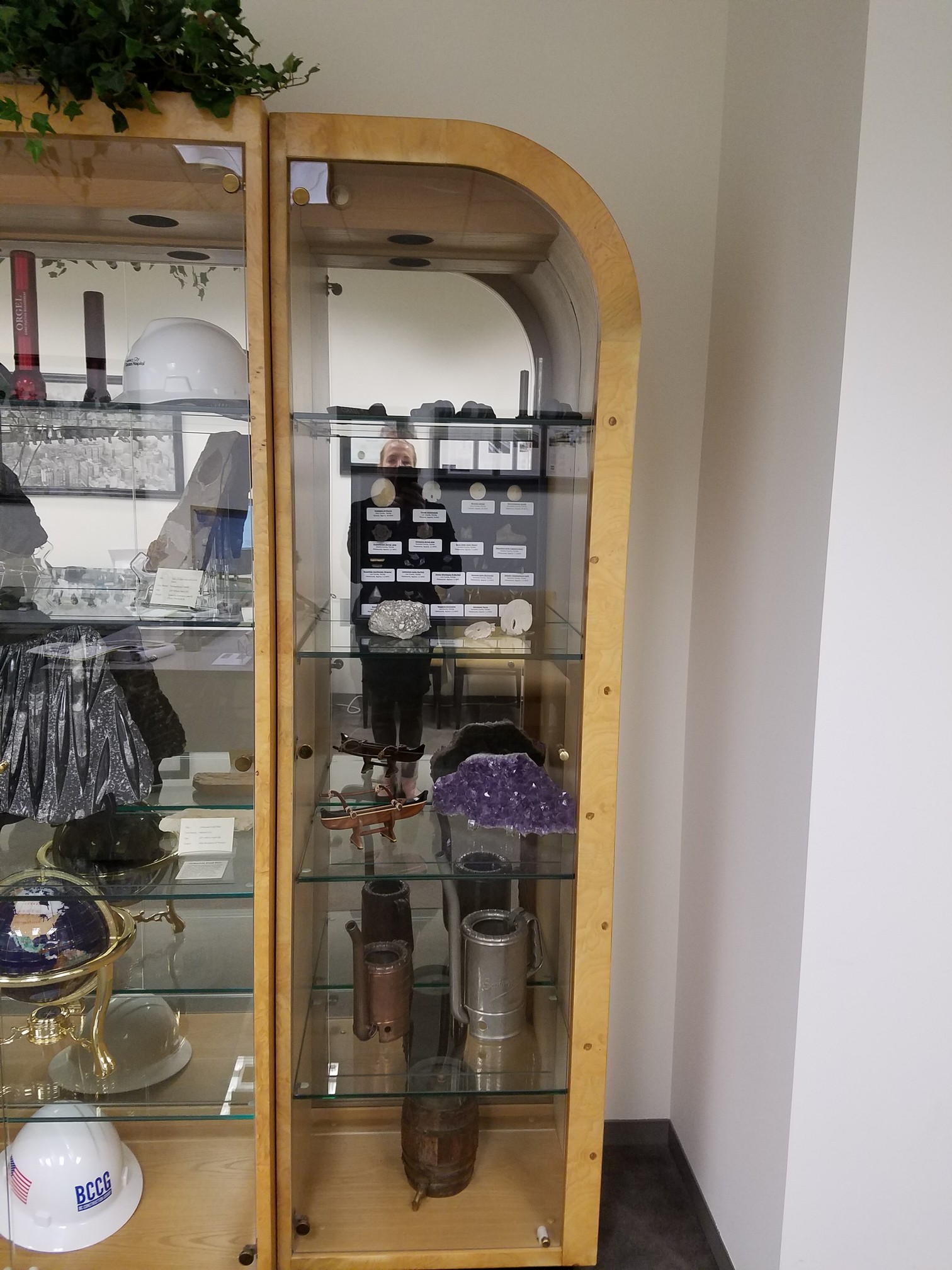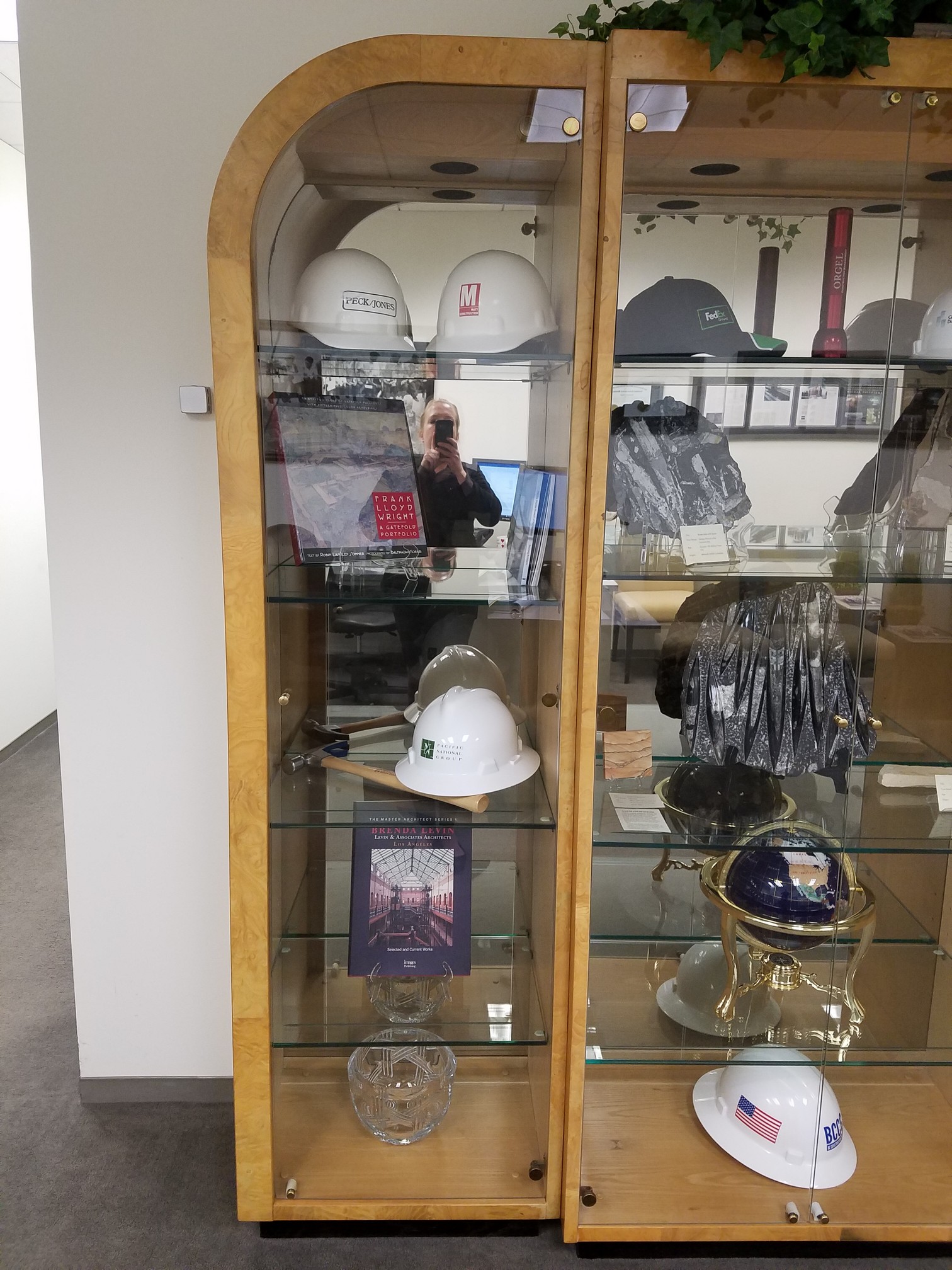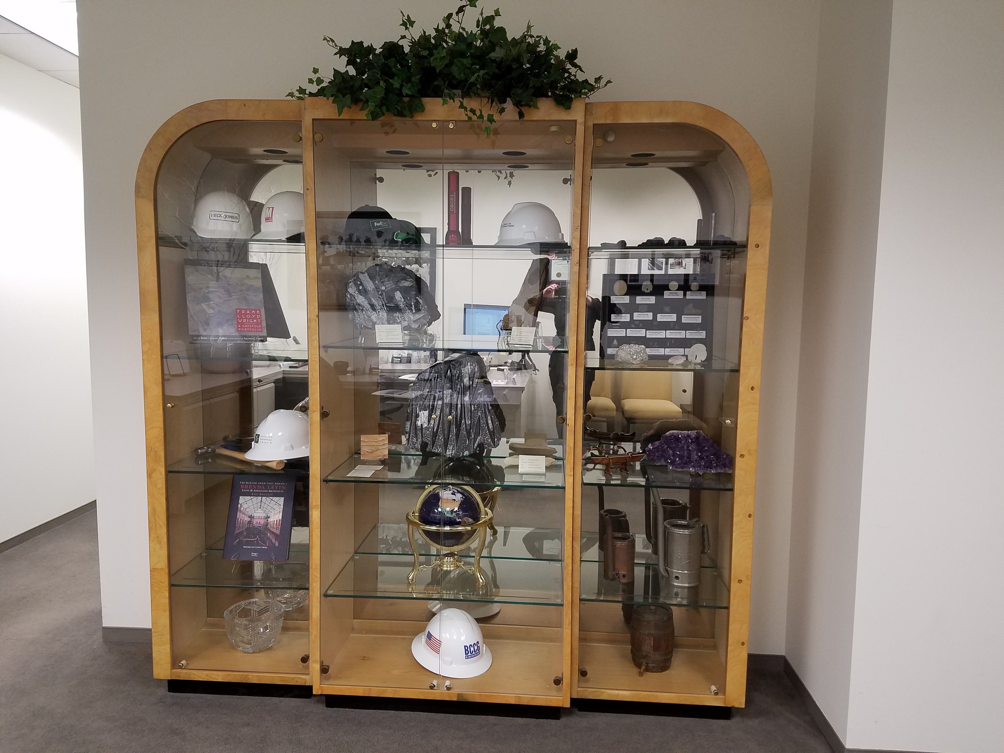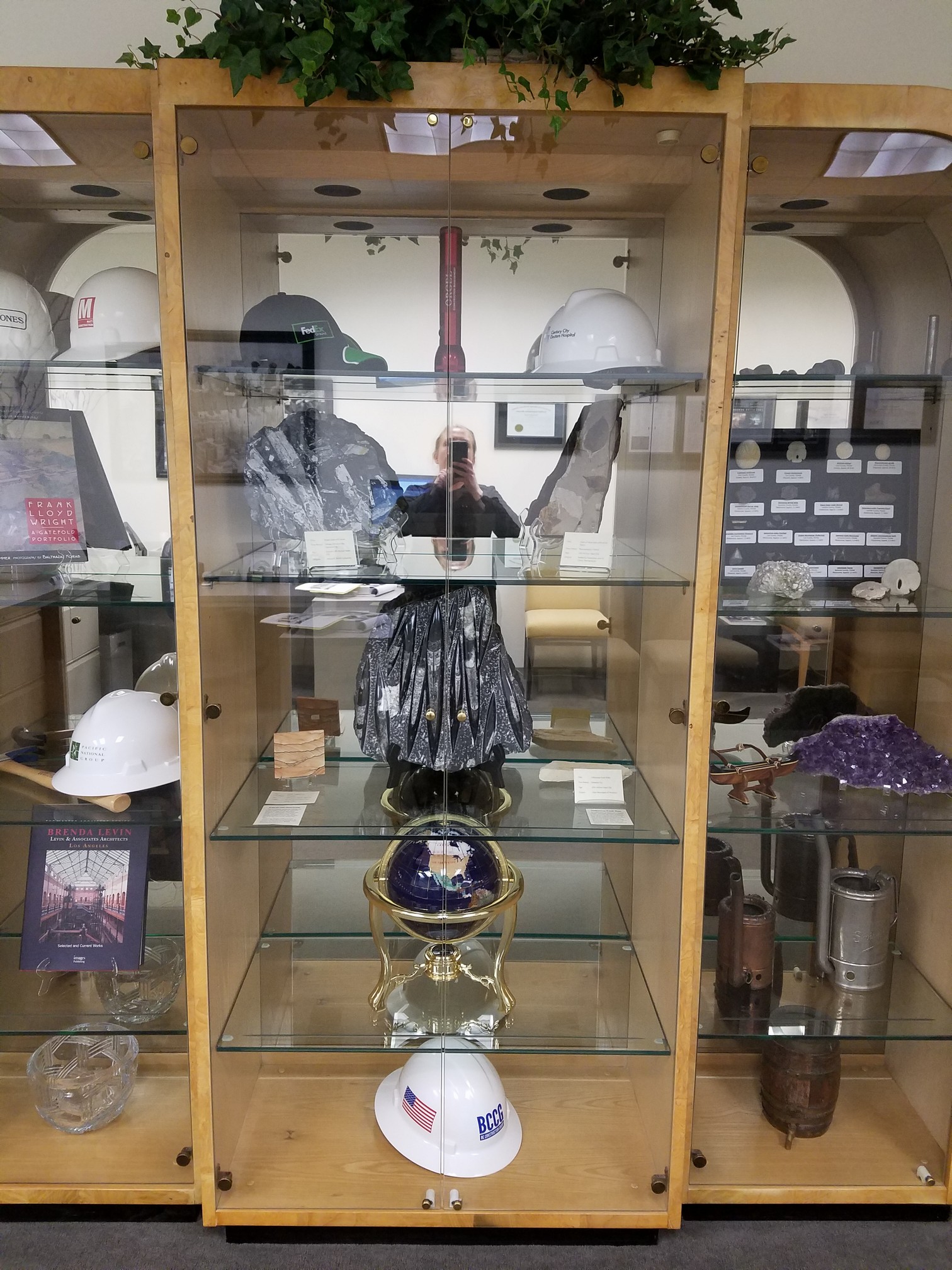 He still has the Manufacturer's brochure, so I know the middle piece is a 9600-60 Alabaster piece that measures: W34 D18 H79. On the left and right of that is another model of a matching wall unit (the 9602-60-L and 9602-60-R). Those each measure: W22.5 D16 H79. All three of those pieces are wood frame with tempered glass doors and 3/8" thick glass shelves. Also, they are all lighted with dimmer switch, and have a solar bronze mirrored back panel. Brochure says Ash solids, ash and ash nurl veneers, Alabaster. It's in great condition still.