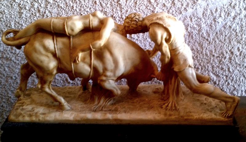Amilcari Santini statue of Hercules fighting the bull of Crete one of his 12 trials. Originally purchased around the 1950's by my father's friend in Italy. My father received the statue in 1976 when his friend past away, and I got the statue in 1998 when my dad passed away. That's all the personal history I know of the statue. I have looked on hundreds of sites regarding Amicare Santini and similar statue makers and haven't found anything regarding this particular statue, but all of the information I have been able to find points to Amilcari Santini and the signature seems to match