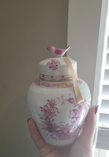 All of the jars I can find in this color scheme have rose knobs on the lids. Any info is very helpful! I cannot find anything about this piece online Bottom of the jar says 6460 with a line an a p engraged in the bottom it also says 6460 Looks to be a number 13 on the bottom as well
