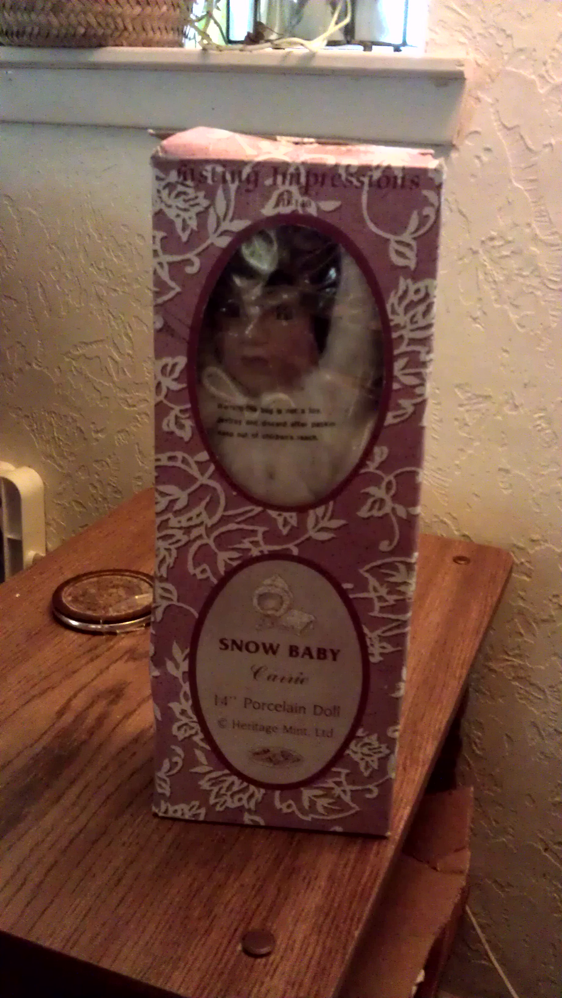 I have had this doll for 18 years... She is made of porcelain. She has white fur outfit and has the certificate as well.