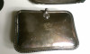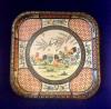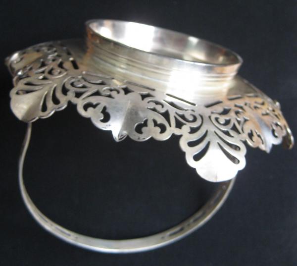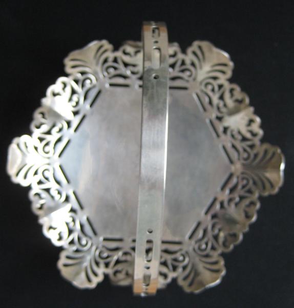 A SMALL, SILVER PLATED, HEXAGONAL SERVING TRAY WITH HANDLE,PROBABLY FOR CANDIES OR COOKIES? DELICATE, CUT-OUT LEAFY DESIGN ON THE EDGES. ENGRAVED LETTER W IN THE CENTER. THIS WAS A WEDDING PRESENT IN cHICAGO, 1945.