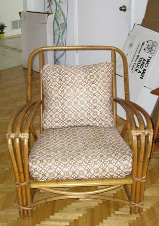 Triple Caned Bent Wood Rattan. Cushions are original Bark Cloth. Couch seat bottom has metal rings screwed into the frame on both ends supporting metal straps that support the cushions. The couch has the Heywood Wakefield logo label on the back bottom of the frame. The chair has a spring system in the bottom to support the bottom cushion. The label on the chair appears to have worn off over the years but this is an exact matching set.