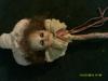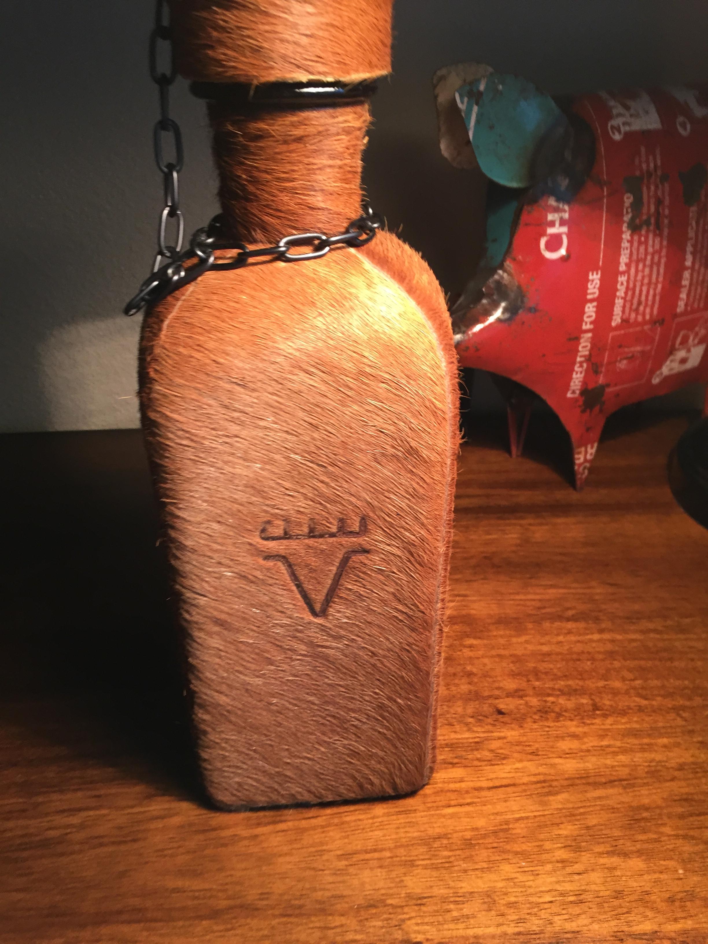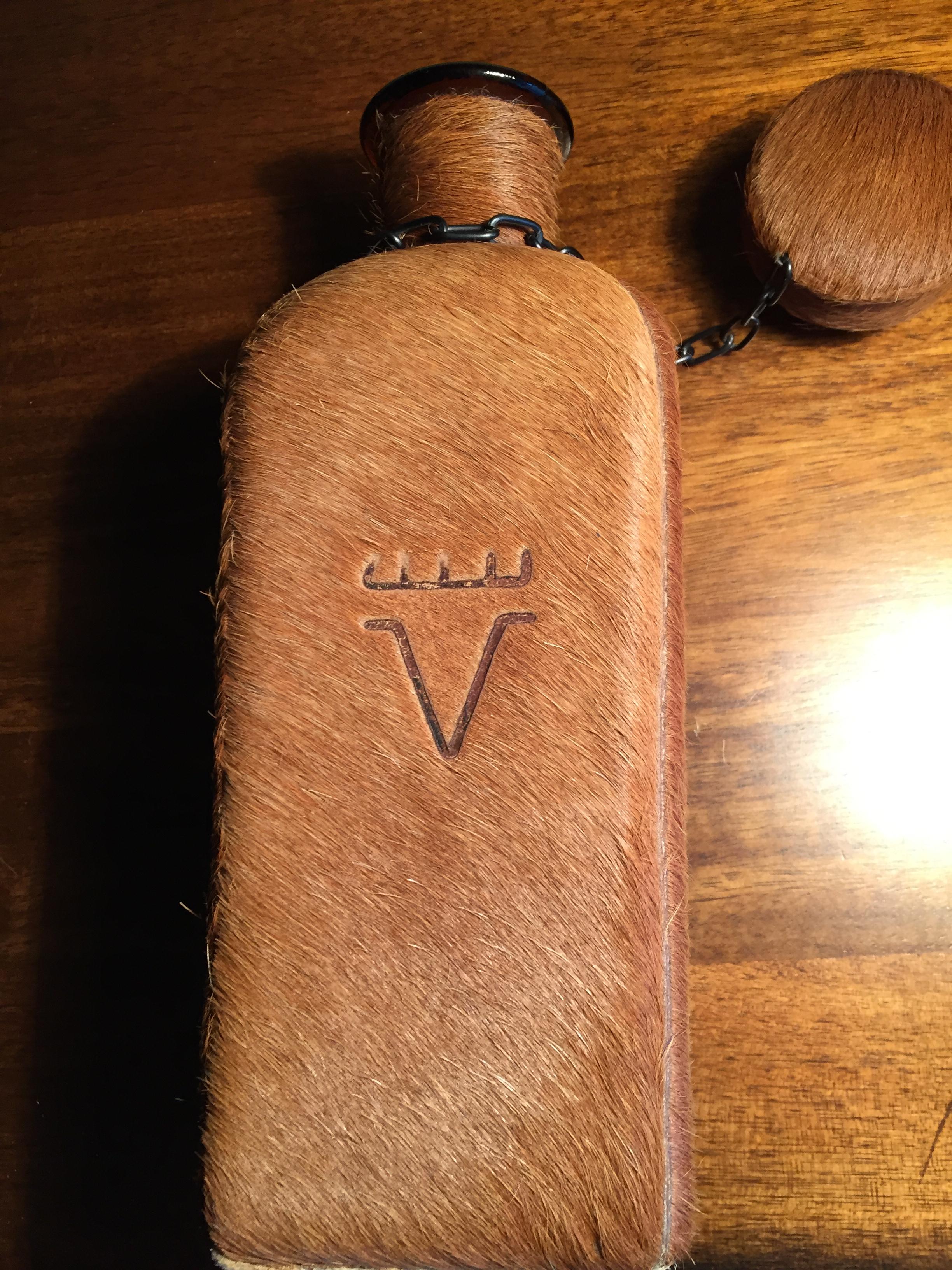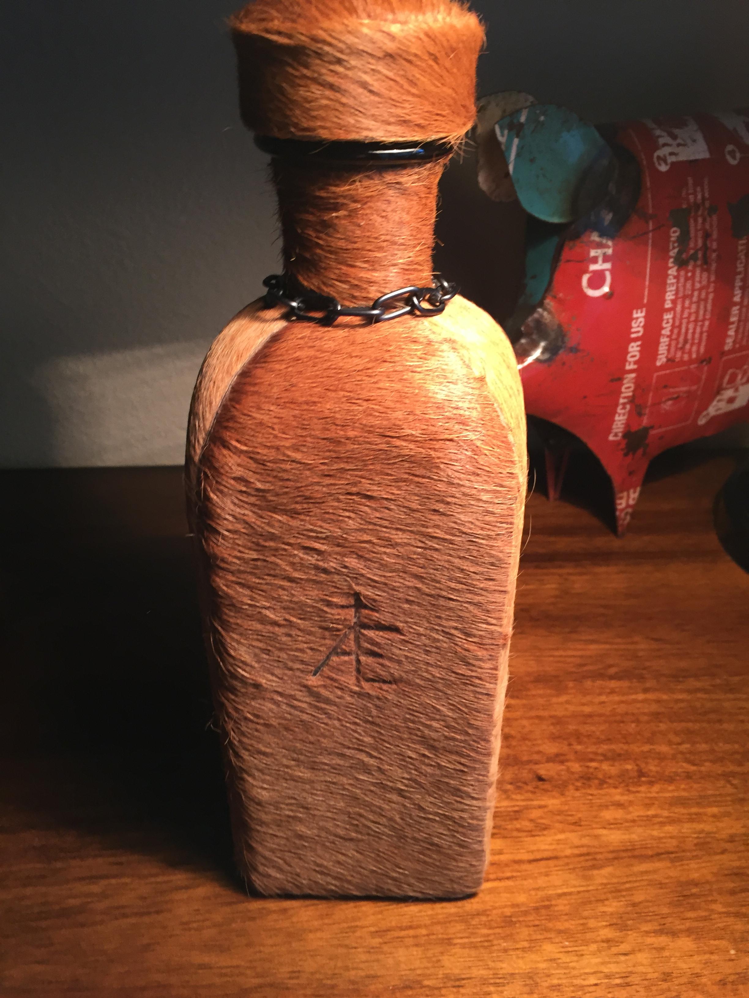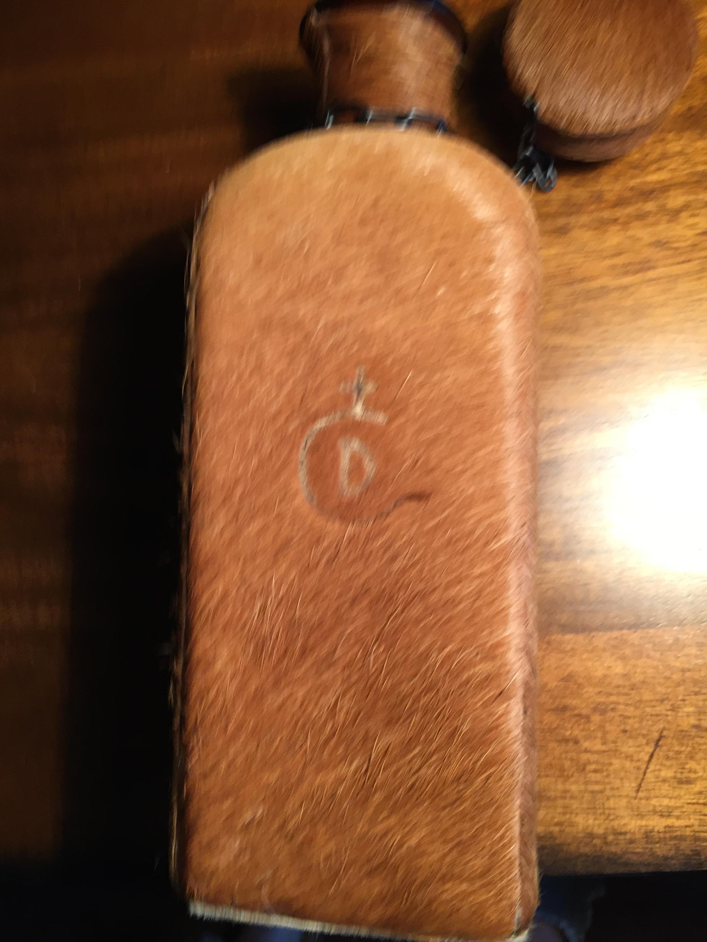 Some kind of hide(brownish in color) wrapped dark colored bottle with a wooden top(chained to the neck of the bottle) with cork on it to fit the top. It has images on all four sides and a label on the bottom that is hardly readable. It measures 11" inches without the top & 12" inches with the top on, all four sides each measure about 4" in width.