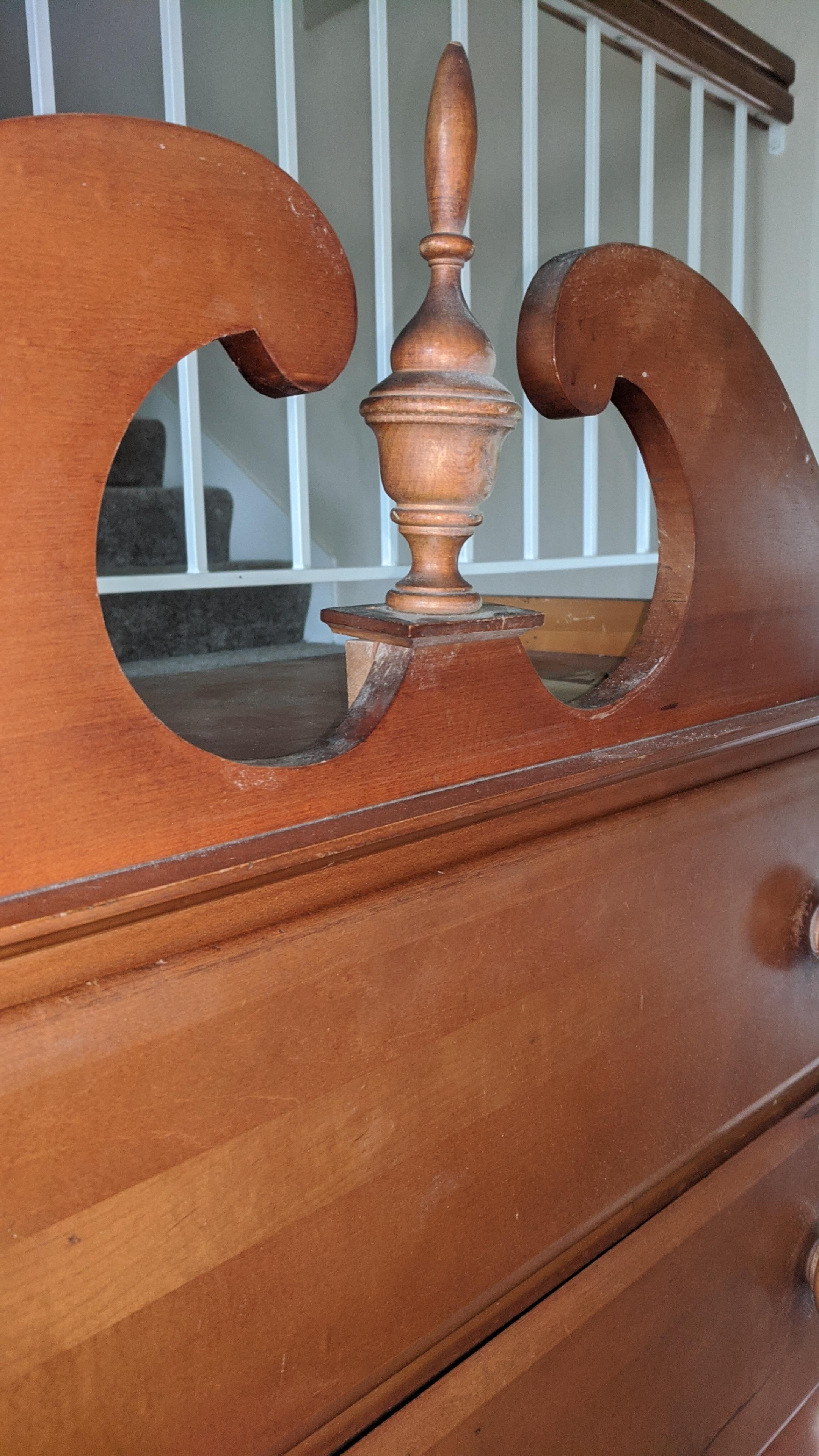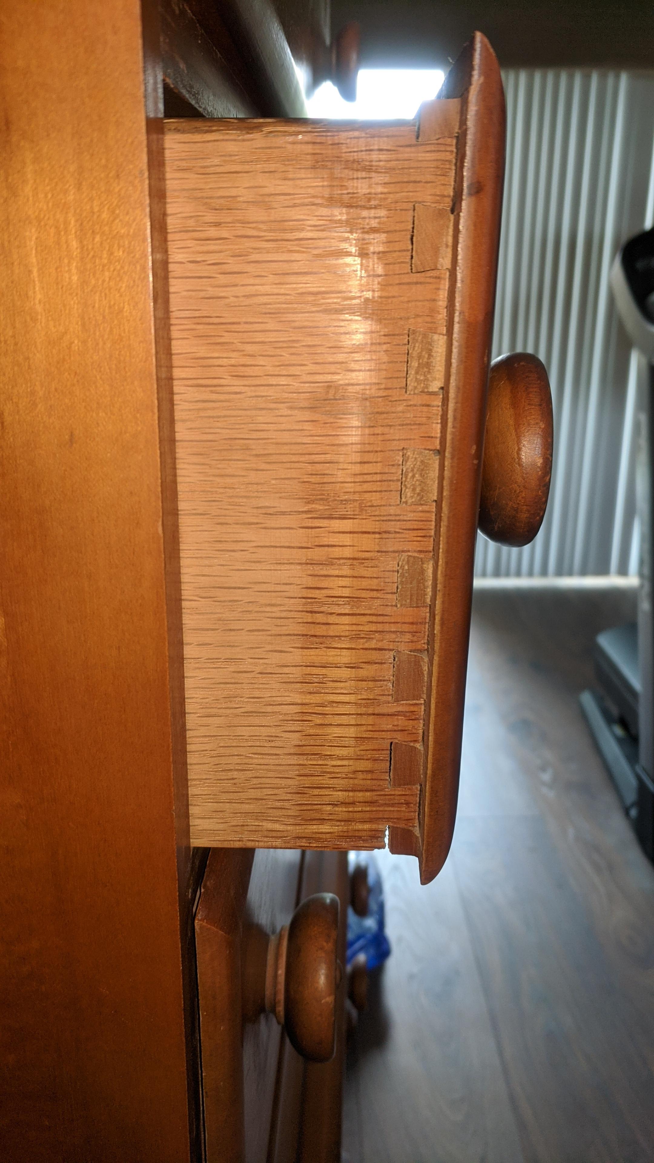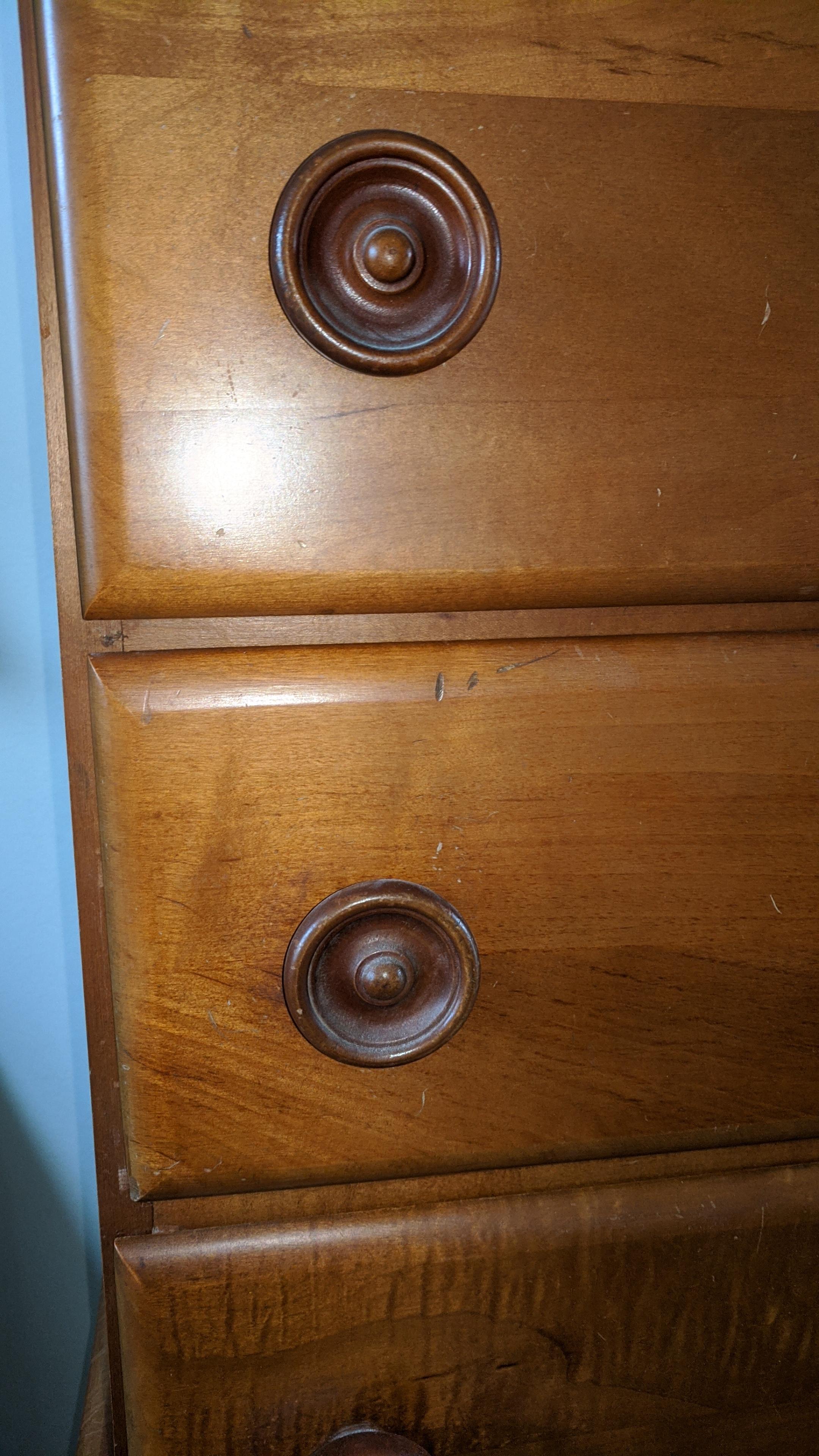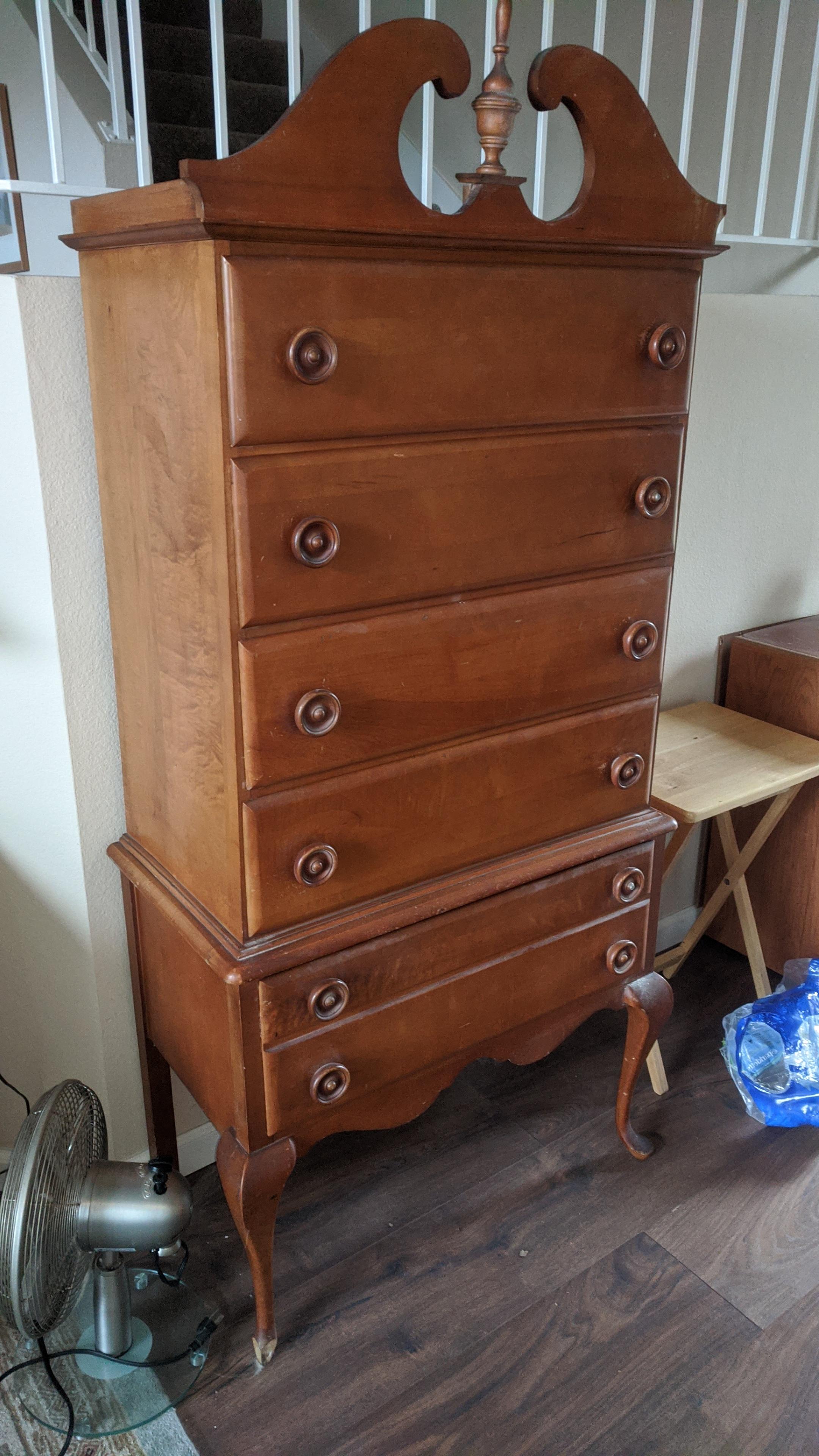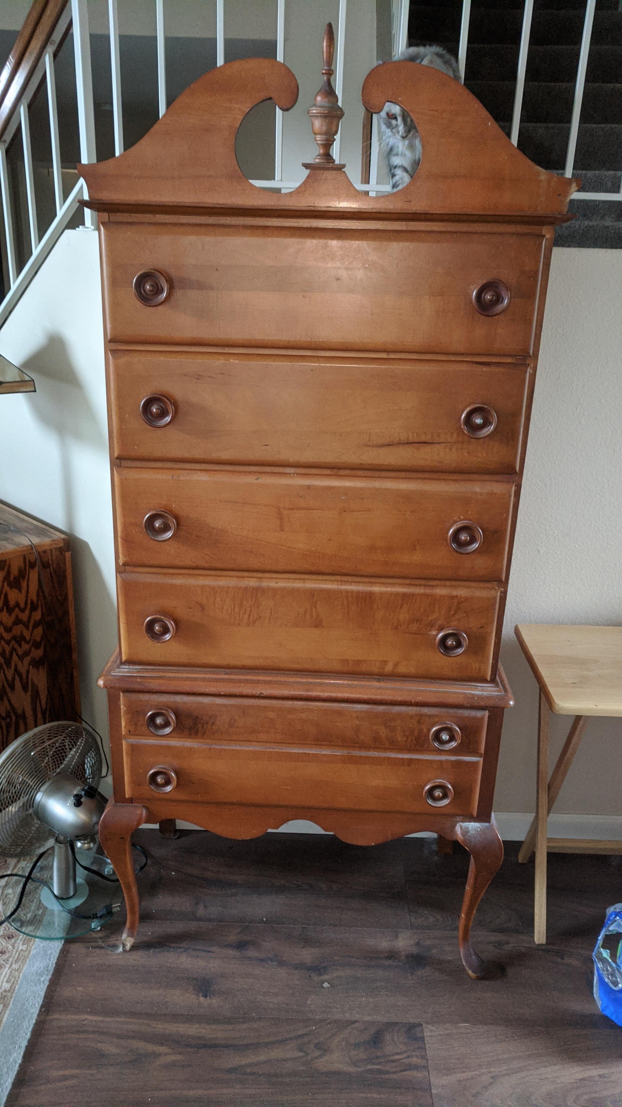 Queen Anne style five drawer highboy dresser made of mahogany or maple. Full bonnet top and capriole legs. Dovetail drawers. Circa 1900.