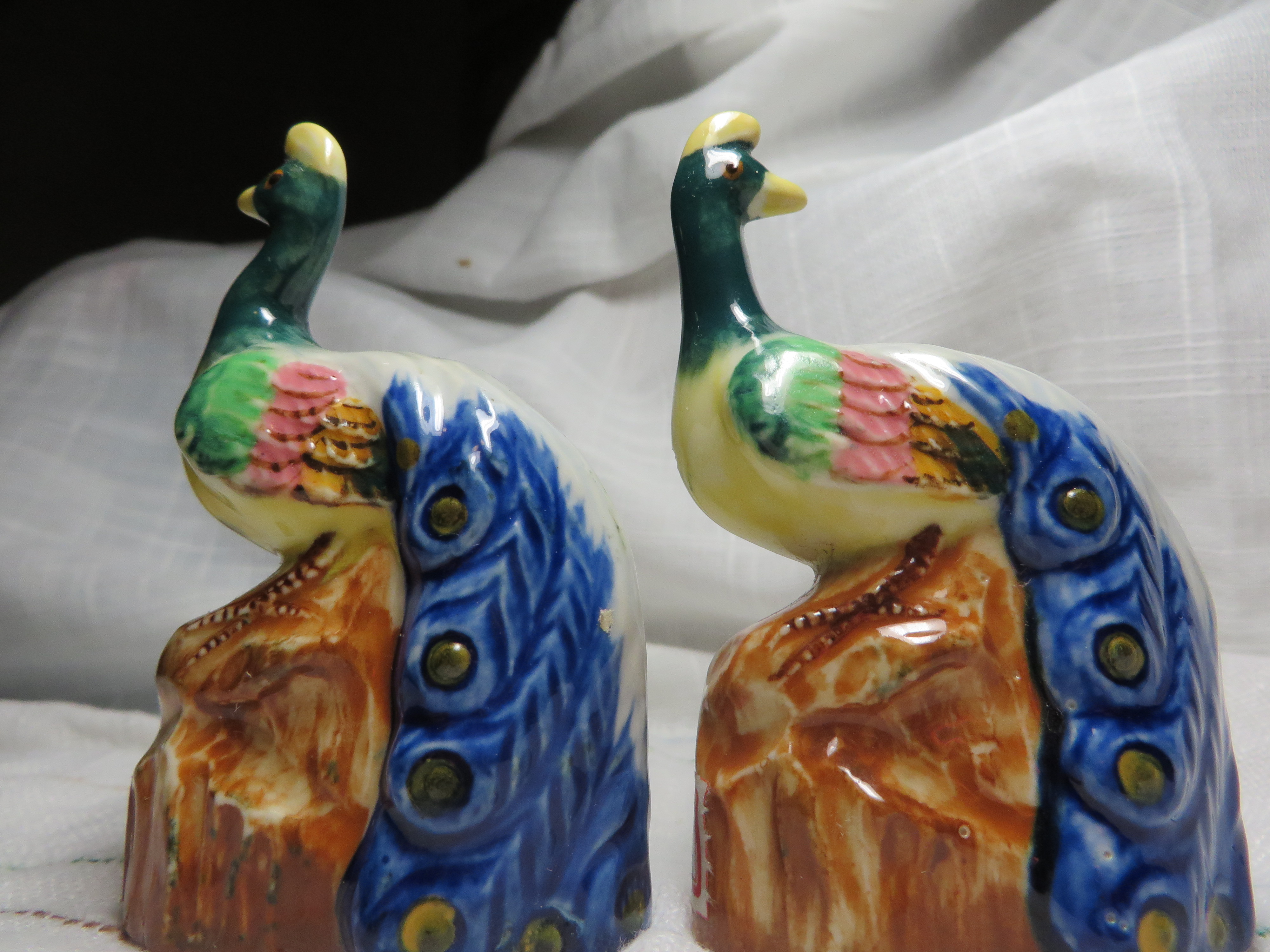 This Salt & Pepper Shaker set of PEACOCKS is marked "Hikariware" and there is a 'H' with a circle around it. Underneath that it is stamped 'Sample" and "Made in Japan"