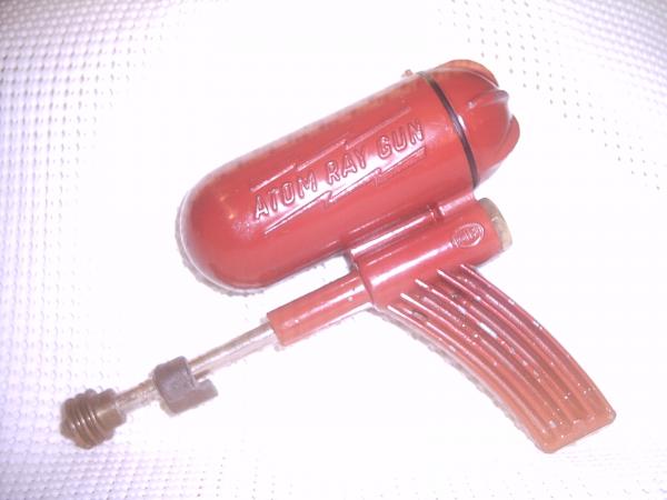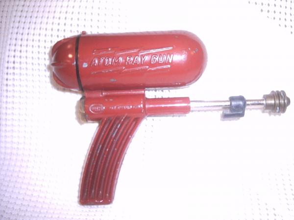 1940's (Hiller)Red-Atom RayGun/Metal Toy Water Gun. Trigger handle is broken, but barrel works and there are some little scratches on the red paint.