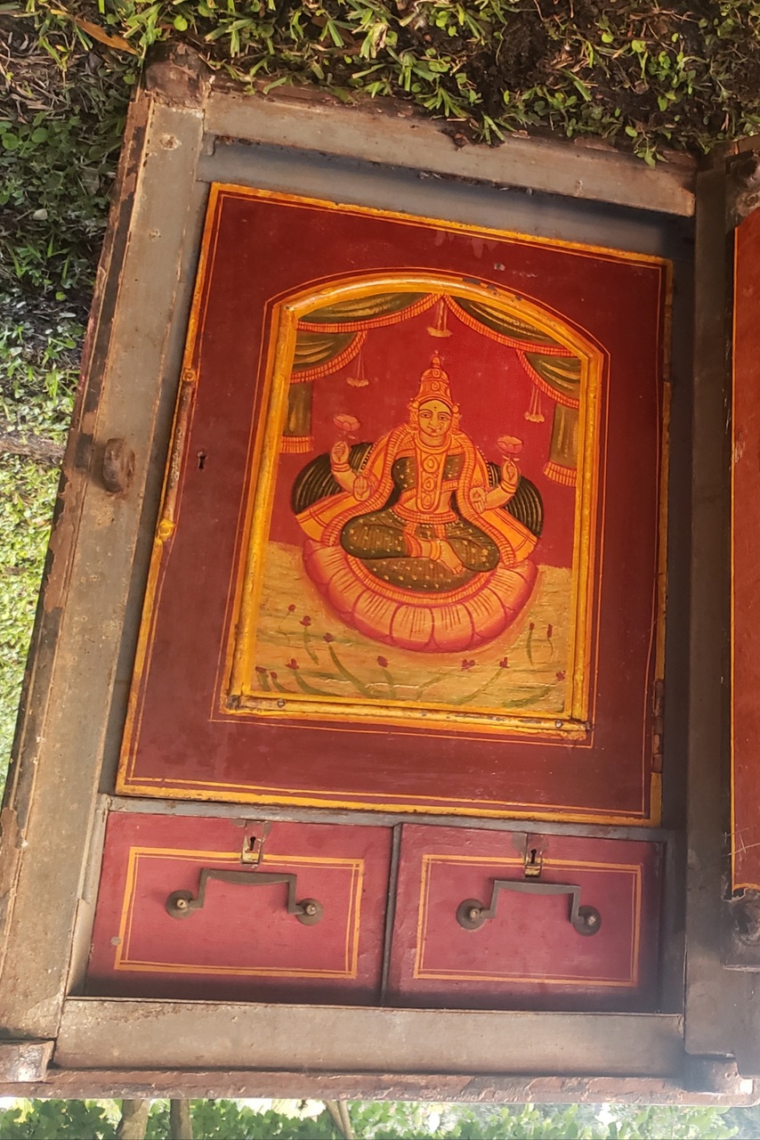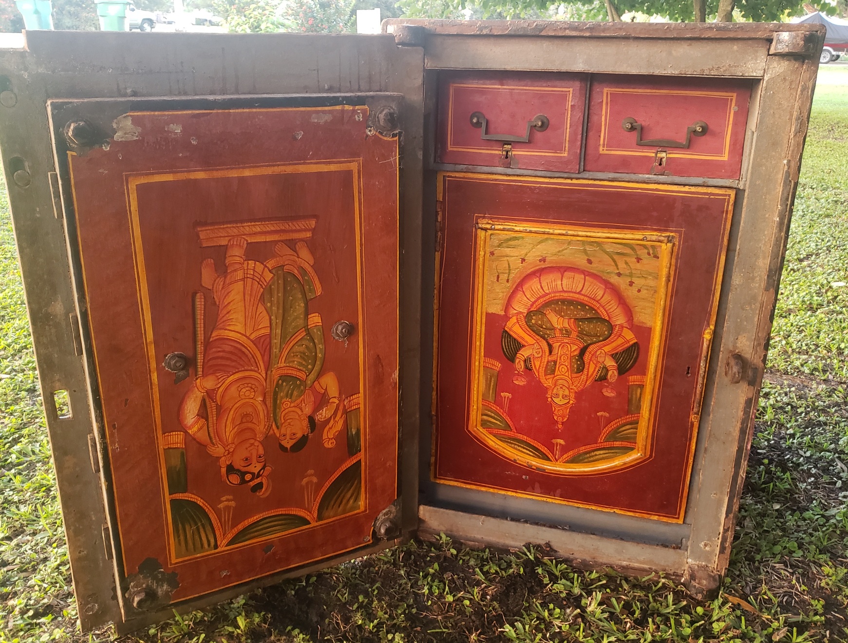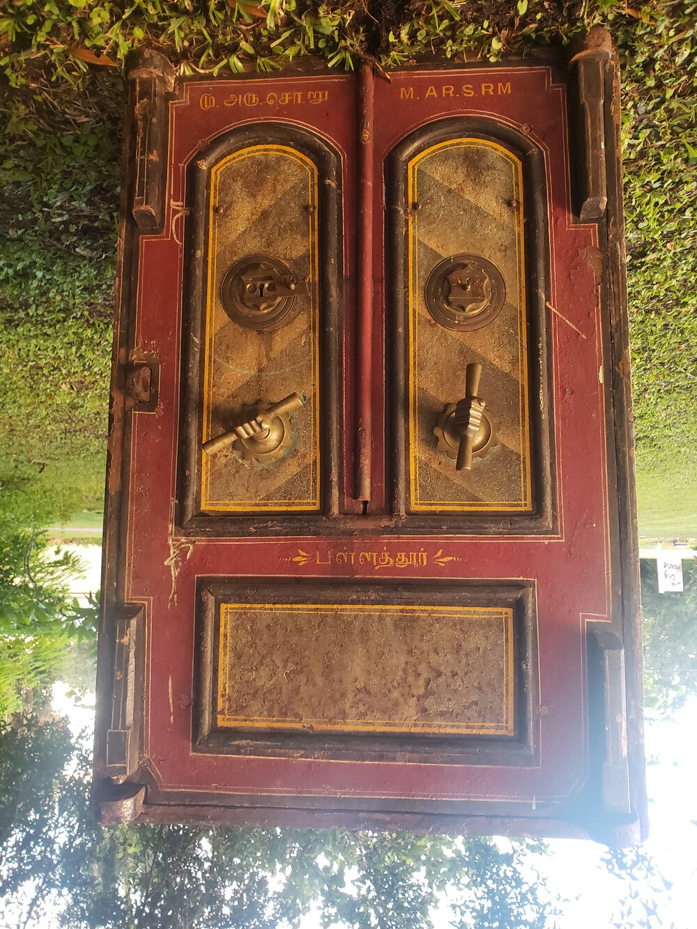 Found this safe yesterday. It's approximately 3 ft tall, 18 inches wide. On the front it says "pallathur" in Tamil. Inside are paintings of, I believe, Lakshmi, the Hindu diety of wealth and good fortune, and Rukmini & Krishna. It is extremely heavy. Has 3 skeleton keys that go to it. I have only been able to find one photo of it online, which I will include, but the article that goes along with it has absolutely nothing to do with the safe itself. I've found a couple somewhat similar photos online but not exact.