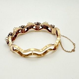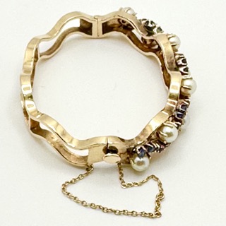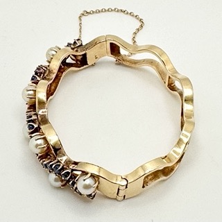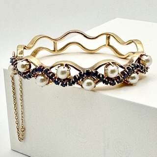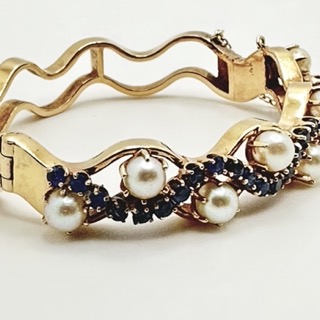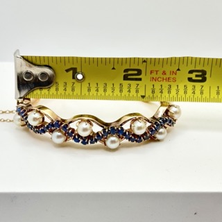Oval Bracelet, Stamped 14K with 8 Pearls and 29 Sapphires. Hinged, fits smaller wrist, very good condition.