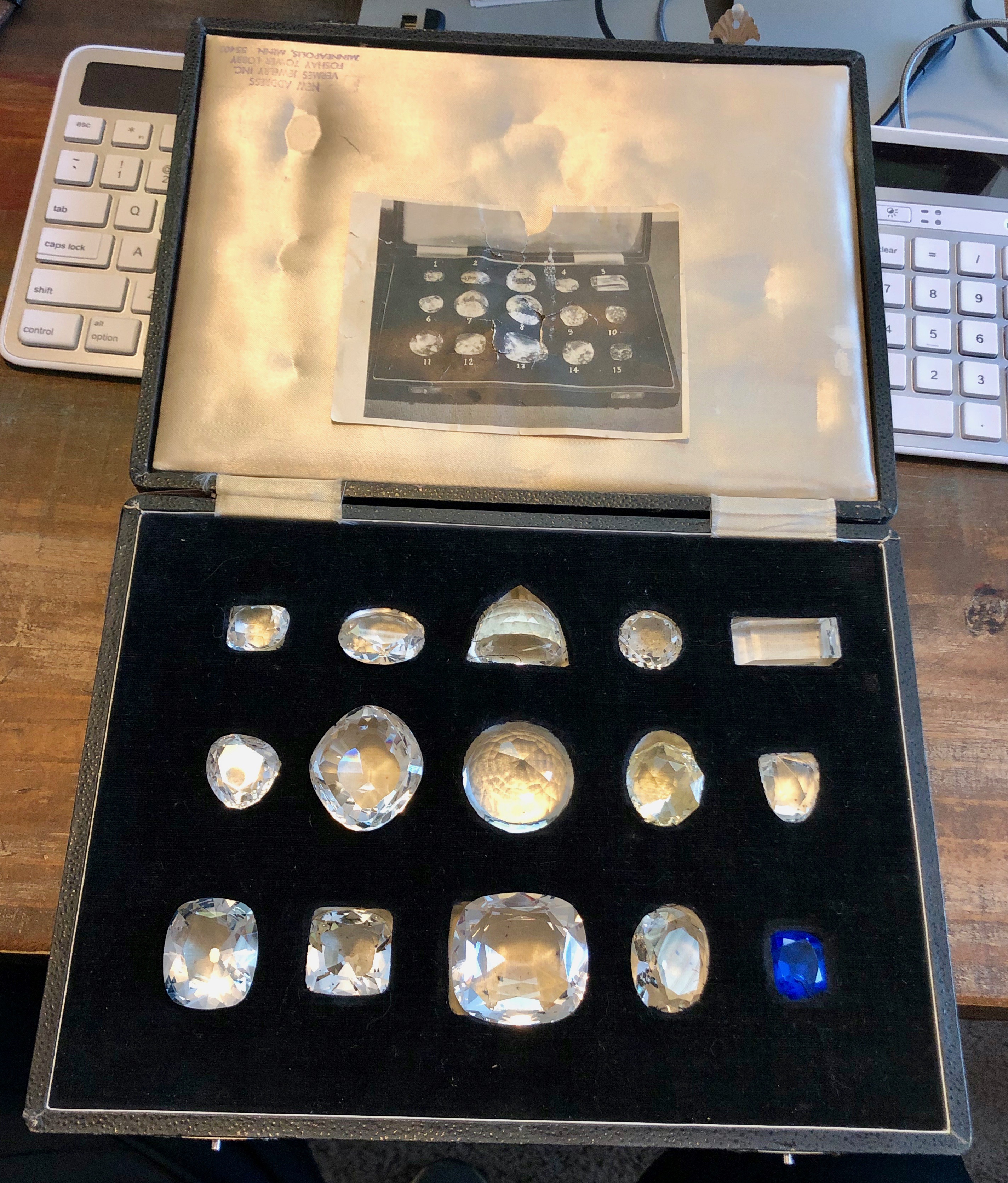 Item 1 is a case showing the stages a rough diamond goes as it is cut and poloshed. The set is complete however there are a few minor nicks on the edges of some "stones".