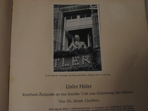 One 1936 Adolf Hitler cigarette album in fair condition. It contains several black and white photos glued to the pages. It's written in German.