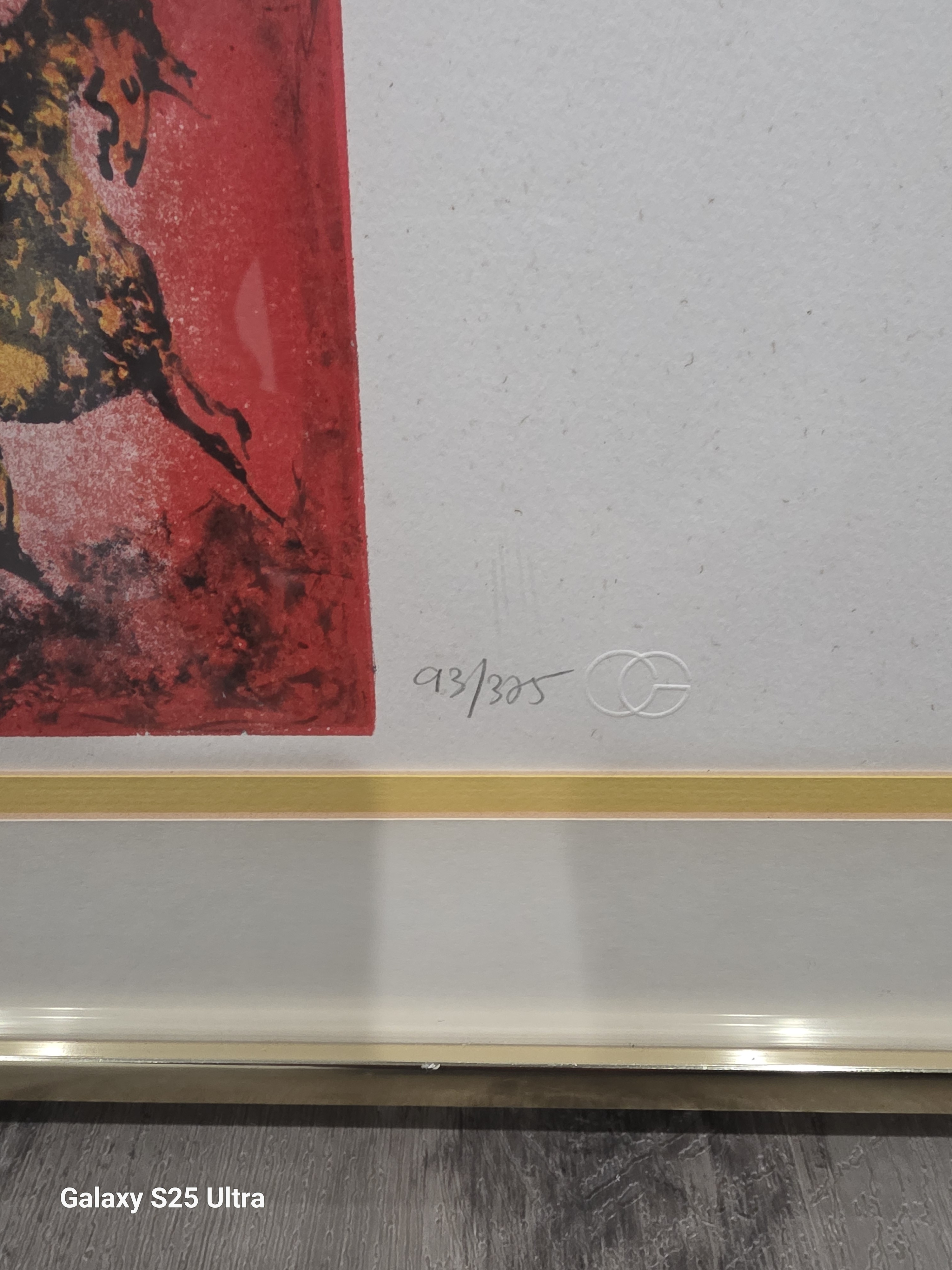 Physical Description: This lithograph features vibrant colors and embossing, measuring 22" x 26" framed, with the lithograph itself measuring 17" x 22". It is a limited edition piece, numbered 93/325, and is pencil signed by the artist. The frame is gold-toned, enhancing the artwork's visual appeal.