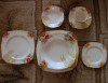 7 dinner plates, 8 lunch, 7 salad, 7 saucers, 4 tea cups, 8 lrg bols, 8 sm bowls, 2 serving bowls w/lids, 1 gravy boat