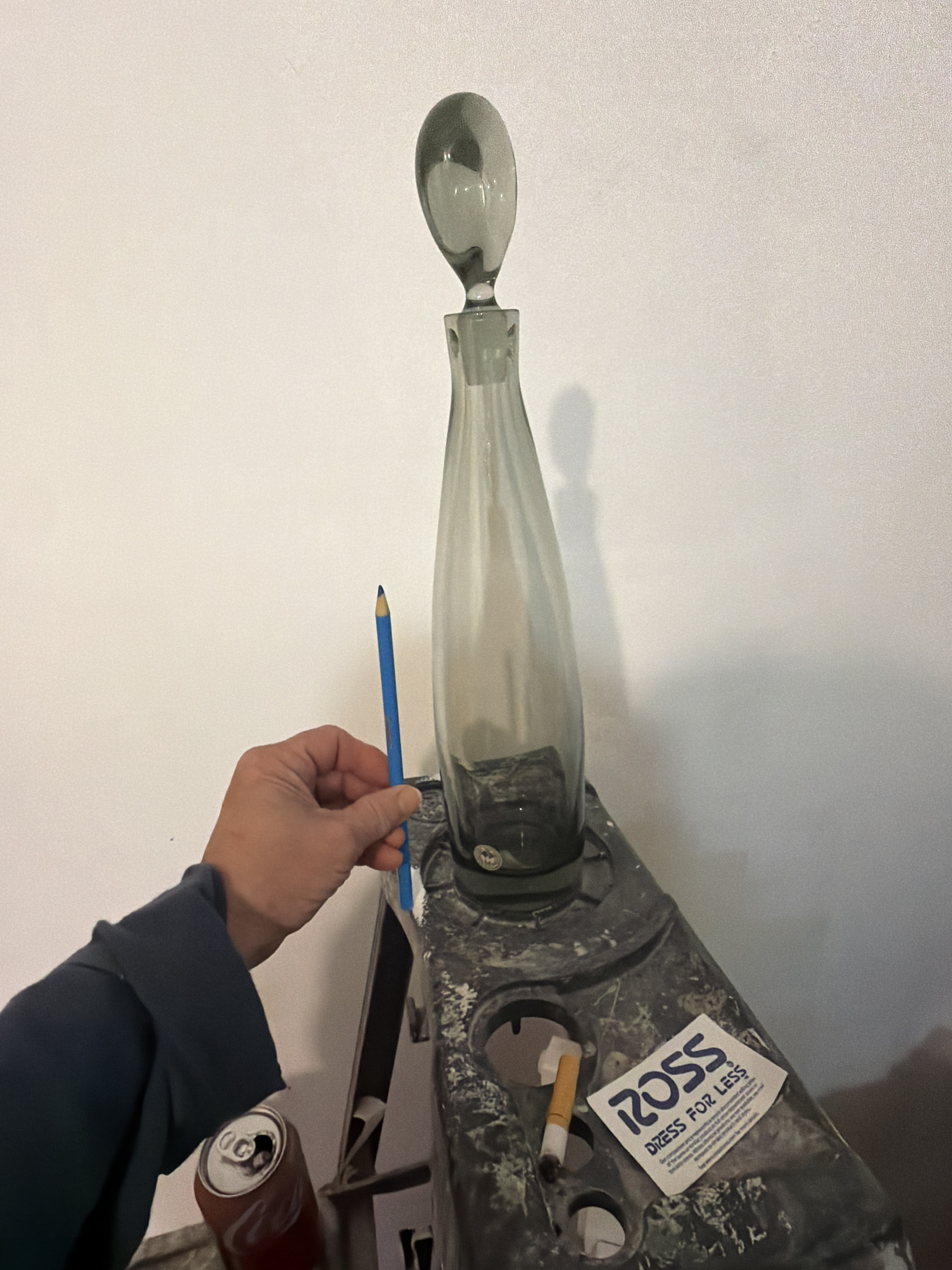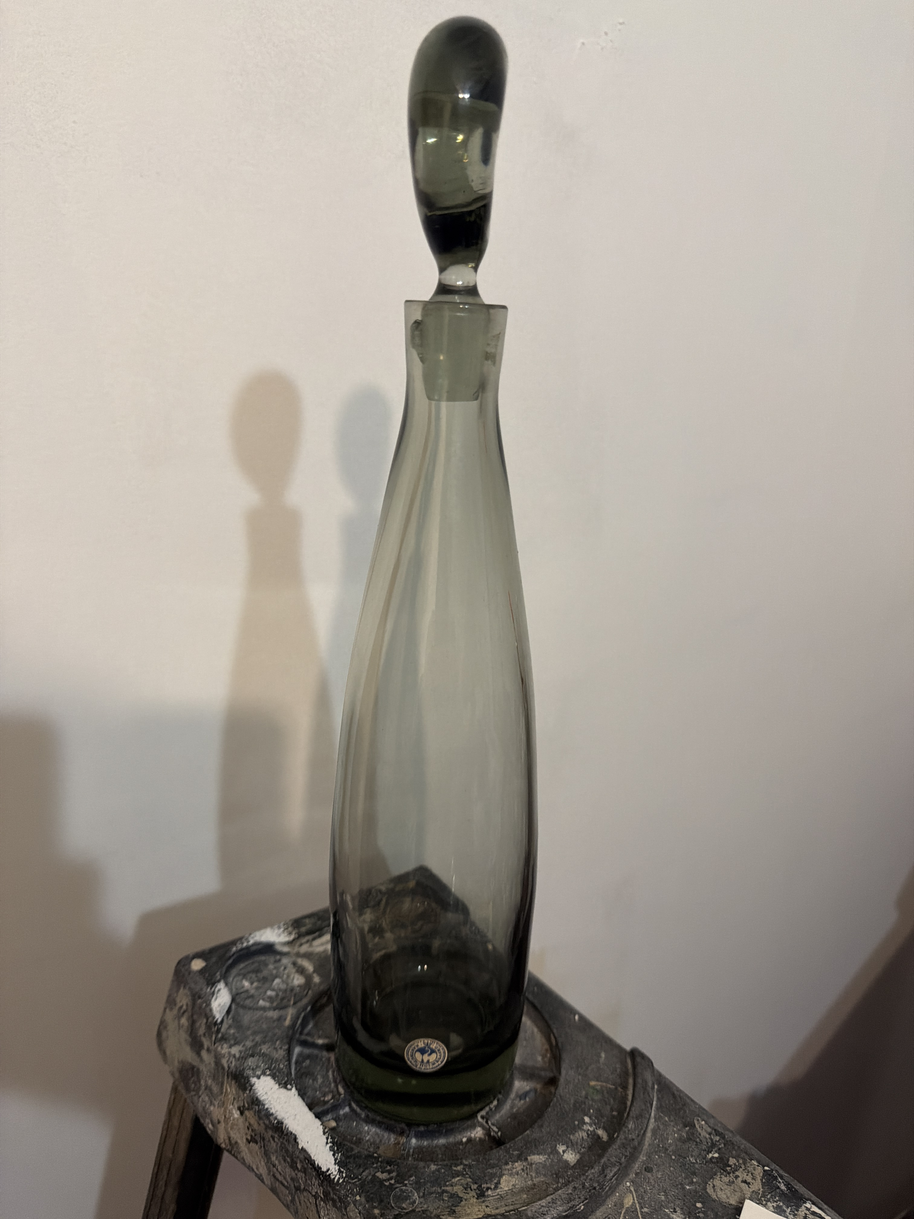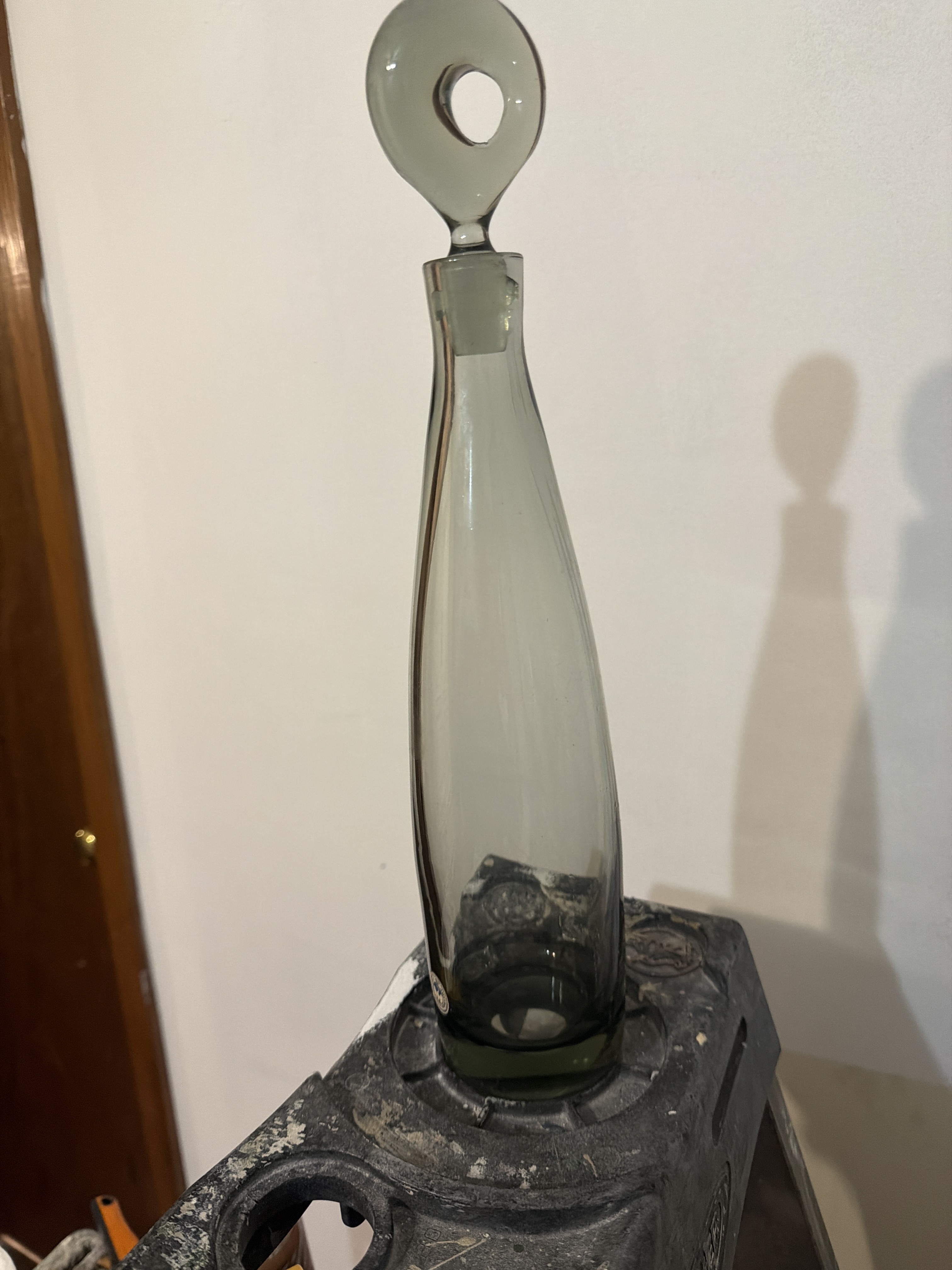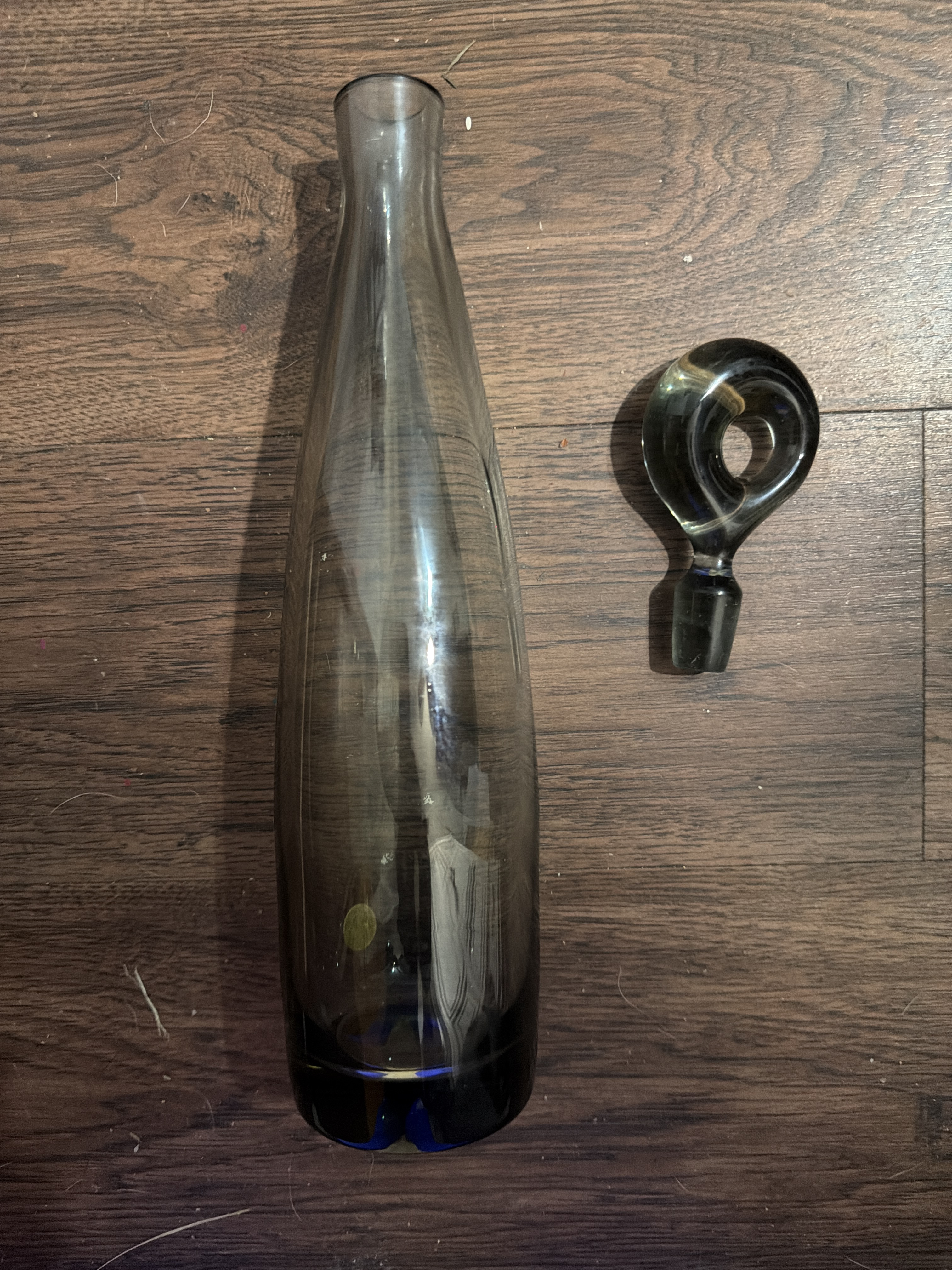 Holmegaard Hand Blown Glass Bottle. Made by Holmegaard. Dating to c. 1960-1980. Materials: Glass. Estimated value: $100 – $200. Condition: Mint. The market for Holmegaard glass is currently stable, with moderate demand among collectors.