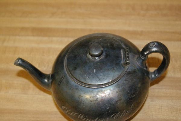 <p>Damaged as it is, and only being silver plate, it has virtually no monetary value. Most teapots of this type date from the first quarter of the 20th Century. The "Old Windsor Club" pulls up quite a few listings, any of which dating back to the early years of the 20th Century could be a candidate for former ownership.</p><p> </p><p>Lovejoy </p>