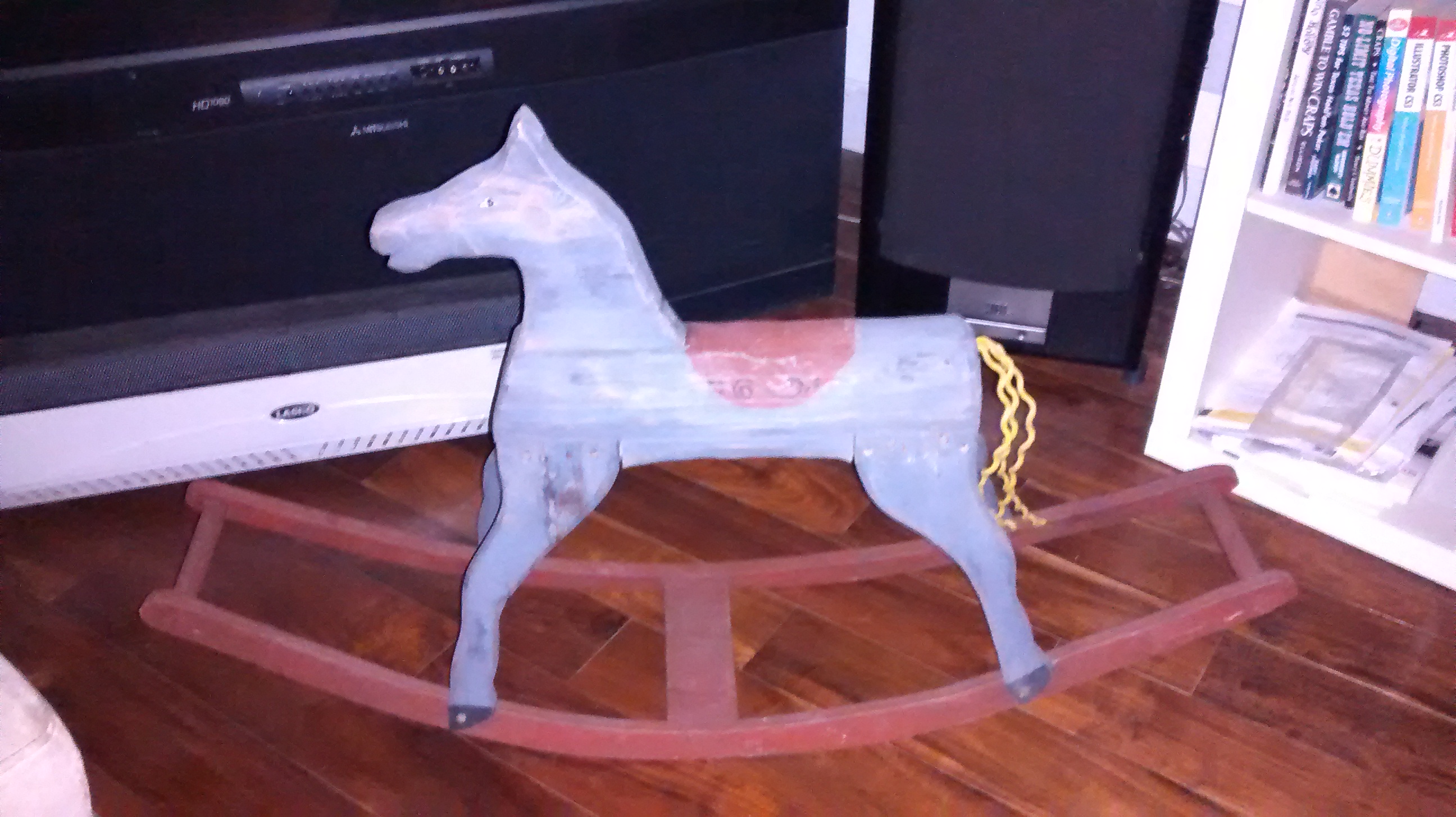 27.5 in. From floor to tips of ears. Rocking blades are 45 in. Long and 11 in. Apart. Found her at a garage sale. She's pretty old and just pretty. Strong enough for many more years of fun.