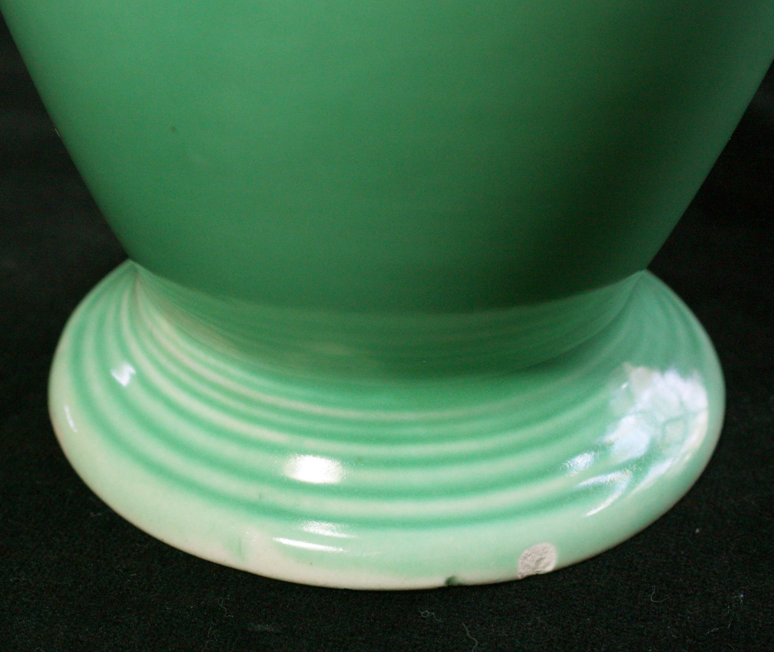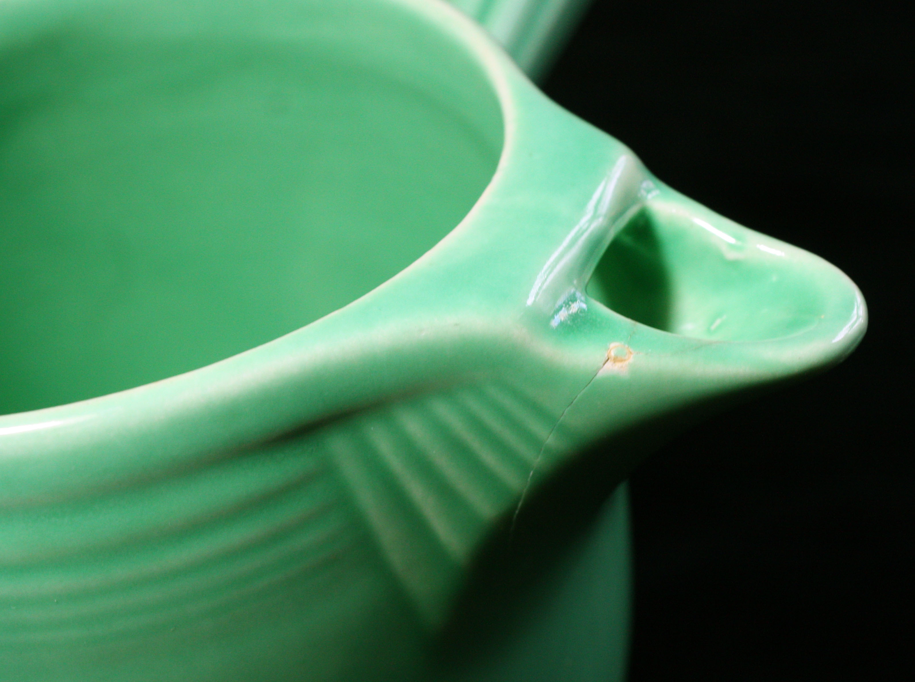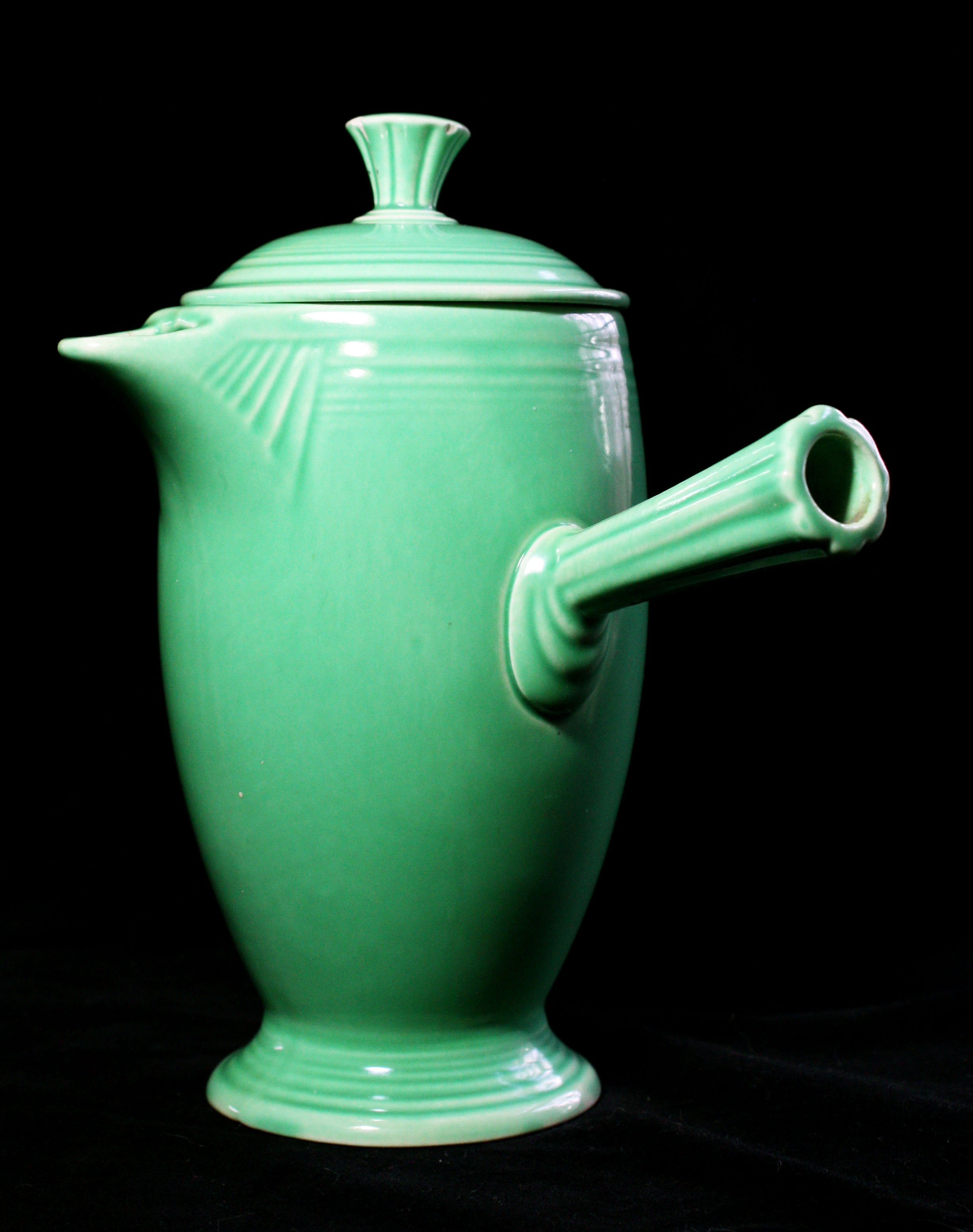 1936-1942: Stick handled Fiestaware demitasse coffeepot discontinued in 1942. Small glaze chip on the edge of the lid and tiny chip on lid handle underneath. Hair line crack on side of spout with small chip. Pin point size glaze chip on body. Two minor chips on the base. Very slight thinning of the paint at the base of the body. Very clean and stain free inside the pot. Beautiful, glossy glaze all over the pot and lid. Has held up well over the years.