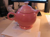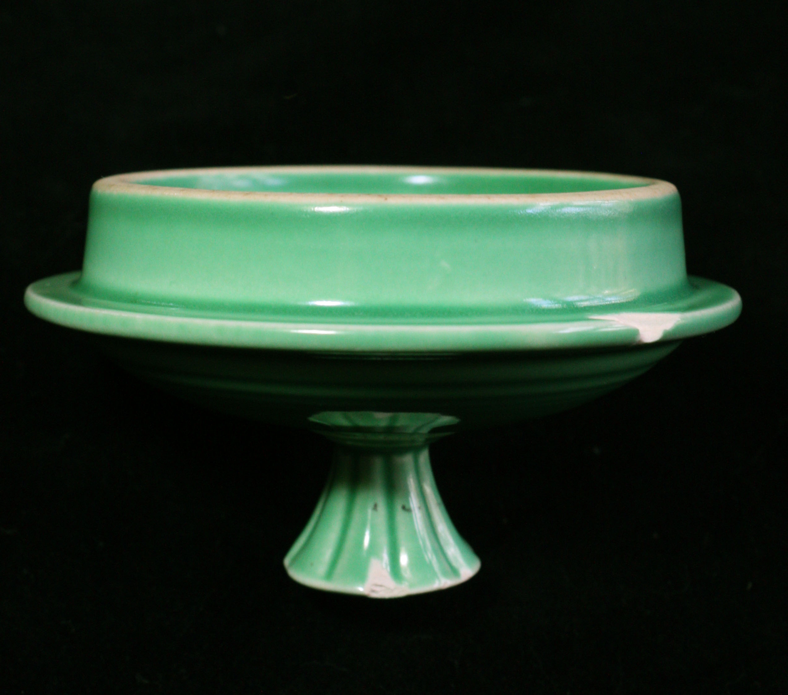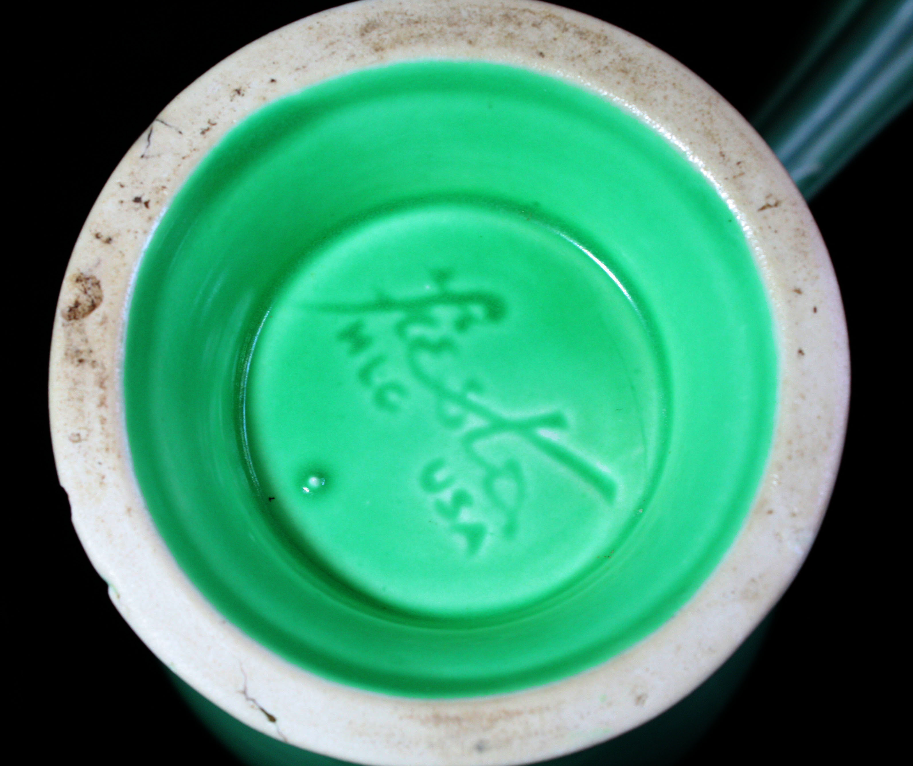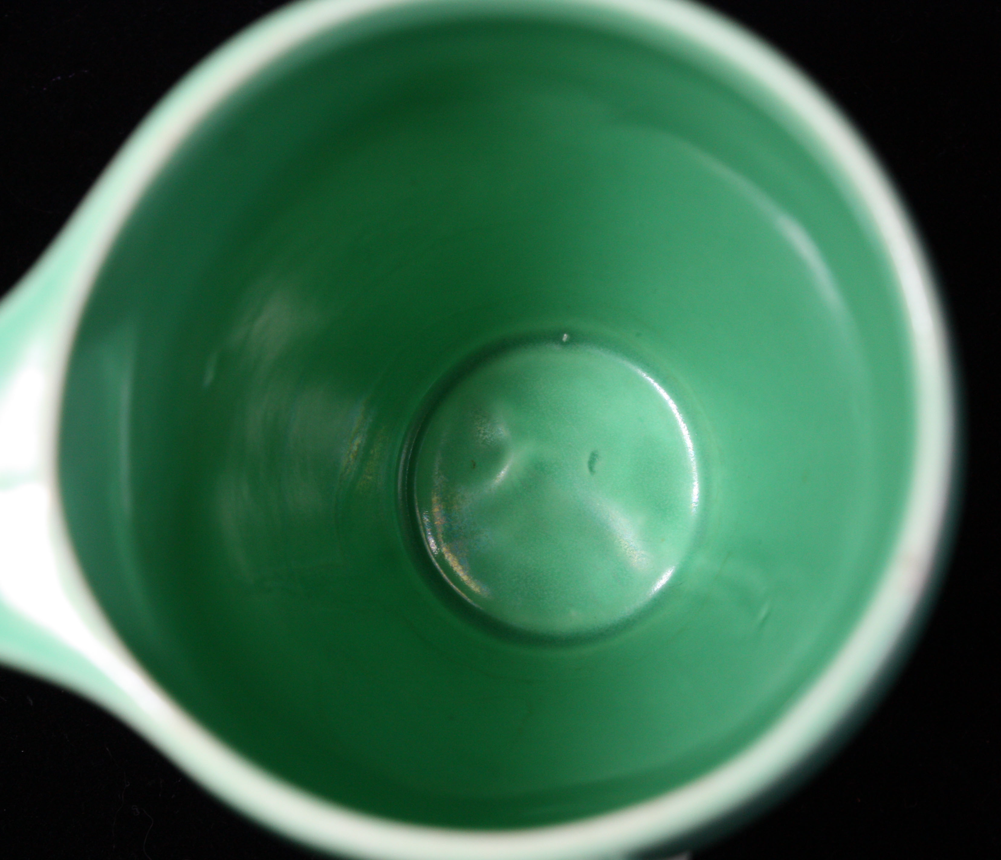 1936-1942: Stick handled Fiestaware demitasse coffeepot discontinued in 1942. Small glaze chip on the edge of the lid and tiny chip on lid handle underneath. Hair line crack on side of spout with small chip. Pin point size glaze chip on body. Two minor chips on the base. Very slight thinning of the paint at the base of the body. Very clean and stain free inside the pot. Beautiful, glossy glaze all over the pot and lid. Has held up well over the years.